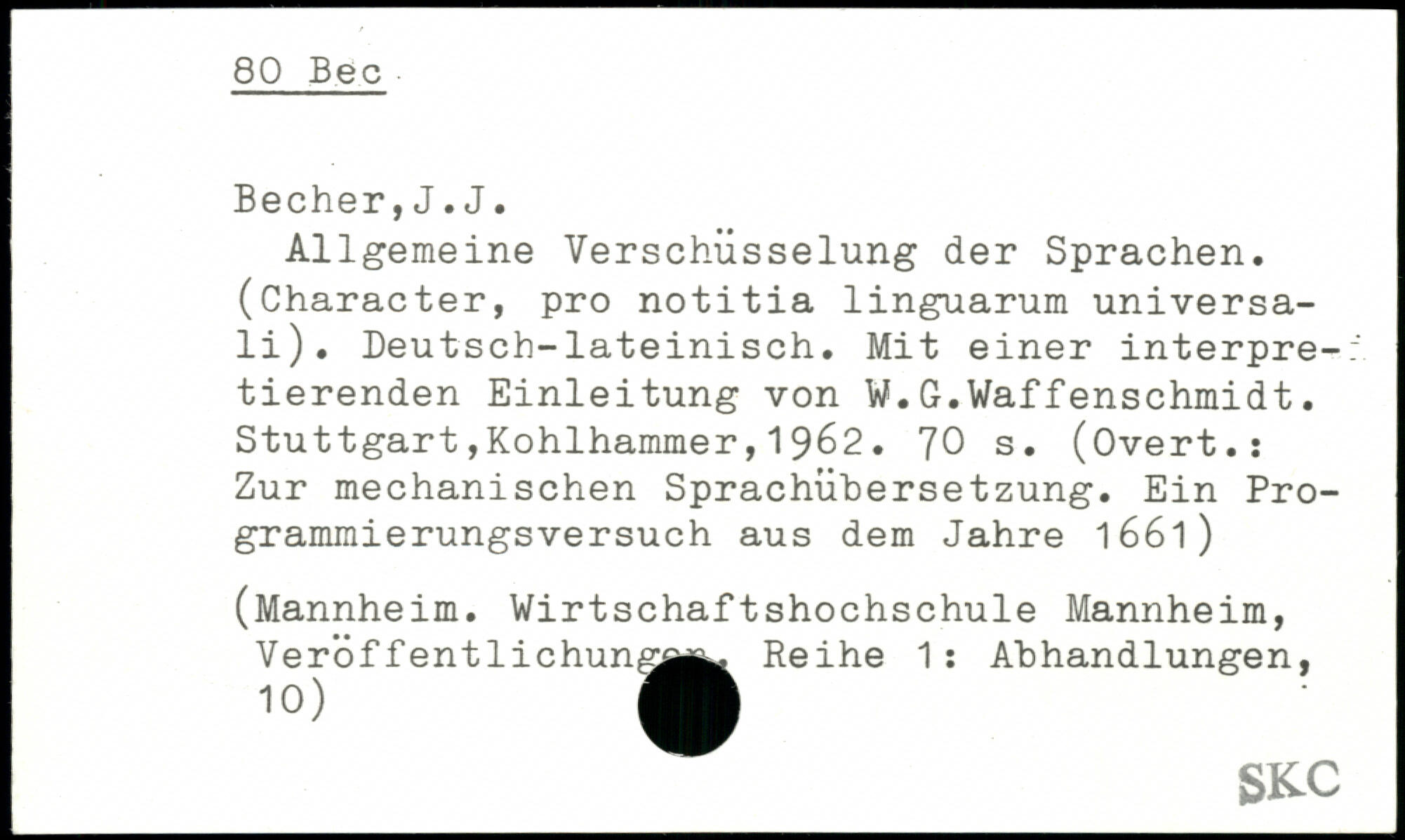 Allgemeine Verschüsselung der Sprachen. (Character, pro notitia linguarum universa-li). Deutsch-lateinisch. Mit einer interpre-:'. tierenden Einleitung von W.G.Waffenschmidt. Stuttgart,Kohlhammer, 1 962. 'JO s. (Overt.: Zur mechanischen Sprachübersetzung. Ein Programmierungsversuch aus dem Jahre 1661) (Mannheim. Wirtschaftshochschule Mannheim, Veröffentlichun^a^ Reihe 1: Abhandlungen, 10) tfp