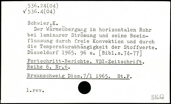 Der Wärmeübergang im horizontalen Rohr bei laminarer Strömung und seine Beeinflussung durch freie Konvektion und durch die Temperaturabhängigkeit der Stoffwerte. Düsseldorf 1965.