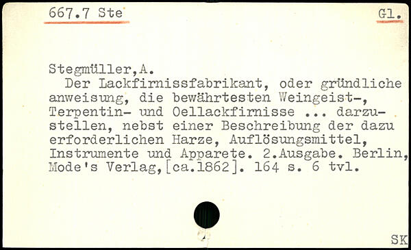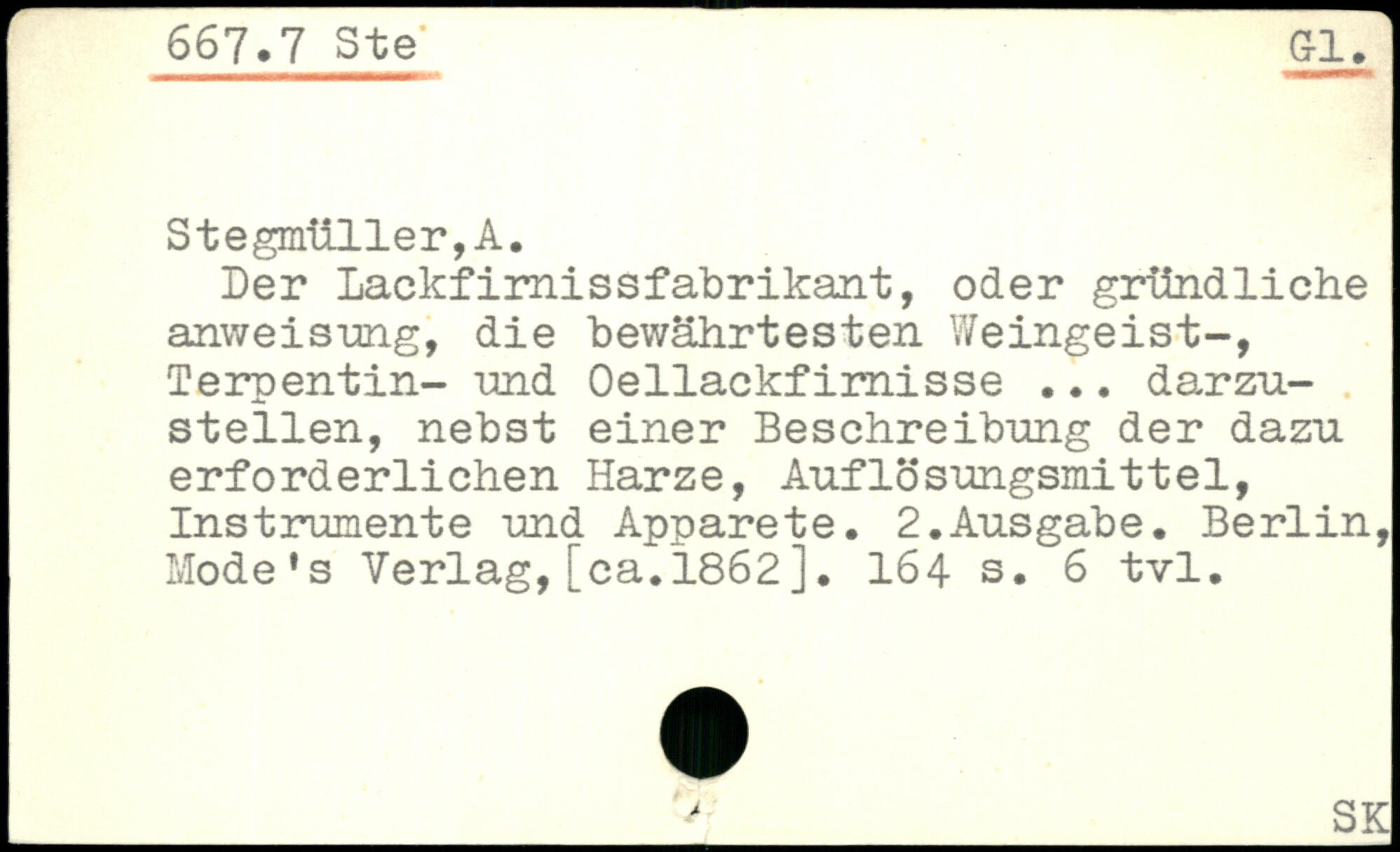 Der Lackfimissfabrikant, oder gründliche anweisung, die bewährtesten Weingeist-, Terpentin- und Oellackf imisse. .. darzustellen, nebst einer Beschreibung der dazu erforderlichen Harze, Auflösungsmittel, Instrumente und Apparete. 2.Ausgabe. Berlin, Mode's Verlag,[ca.1862].
