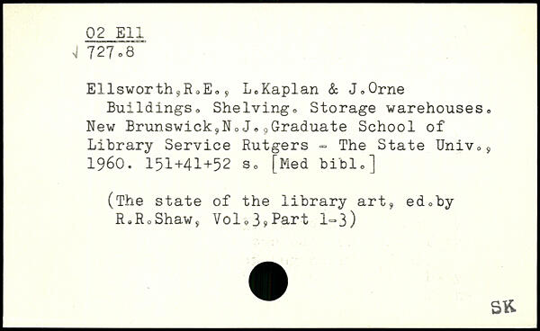 Ellsworth9RoE.9 L,Kaplan & J,0rne Buildings,, Shelving, Storage warehouses, New Brunswick,NoJ,9Graduate School of Library Service Rutgers - The State Univ,, 1960.