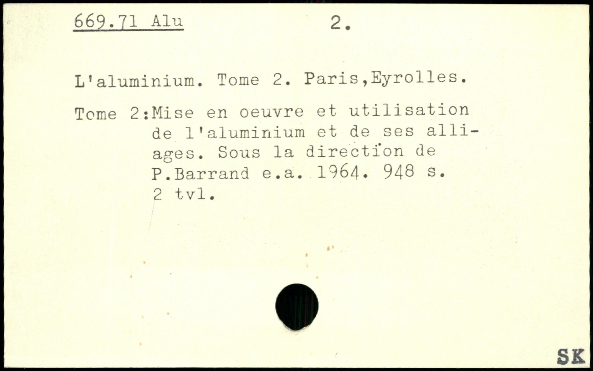 L'aluminium. Tome 2. Paris,Eyrolles. Tome 2;Mise en oeuvre et utilisation de l'aluminium et de ses alliages. Sous la direction de P.Barrand e.a. 1964.