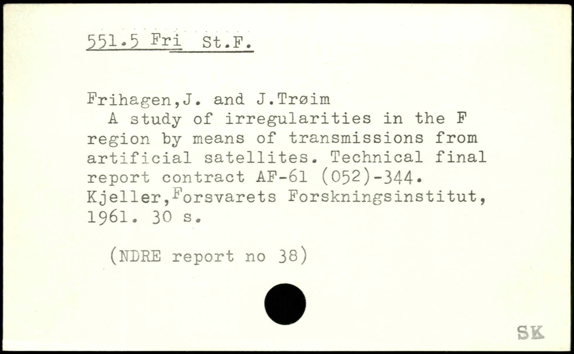 A study of irregularities in the P region by means of transmissions from artificial satellites. Technical final report contract AF-61 (052)-344, Kjeller, ^orsvarets Porskningsinstitut, 1961.