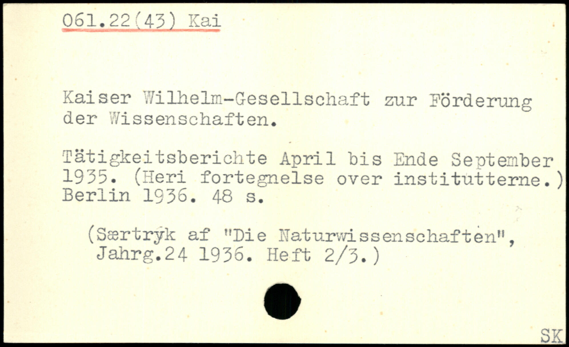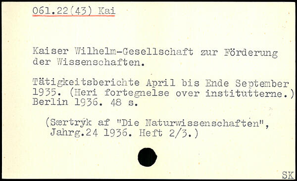 Kaiser Wilhelm-Gesellschaft zur Korderang der Wissenschaften. Tätigkeitsberichte April bis Ende September 1935. (Heri fortegnelse over institutterne.)