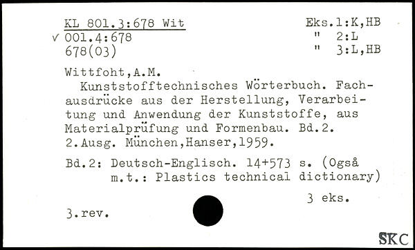 Kunststofftechnisches Wörterbuch. Fach-ausdrücke aus der Herstellung, Verarbeitung und Anwendung der Kunststoffe, aus Materialprüfung und Formenbau.
