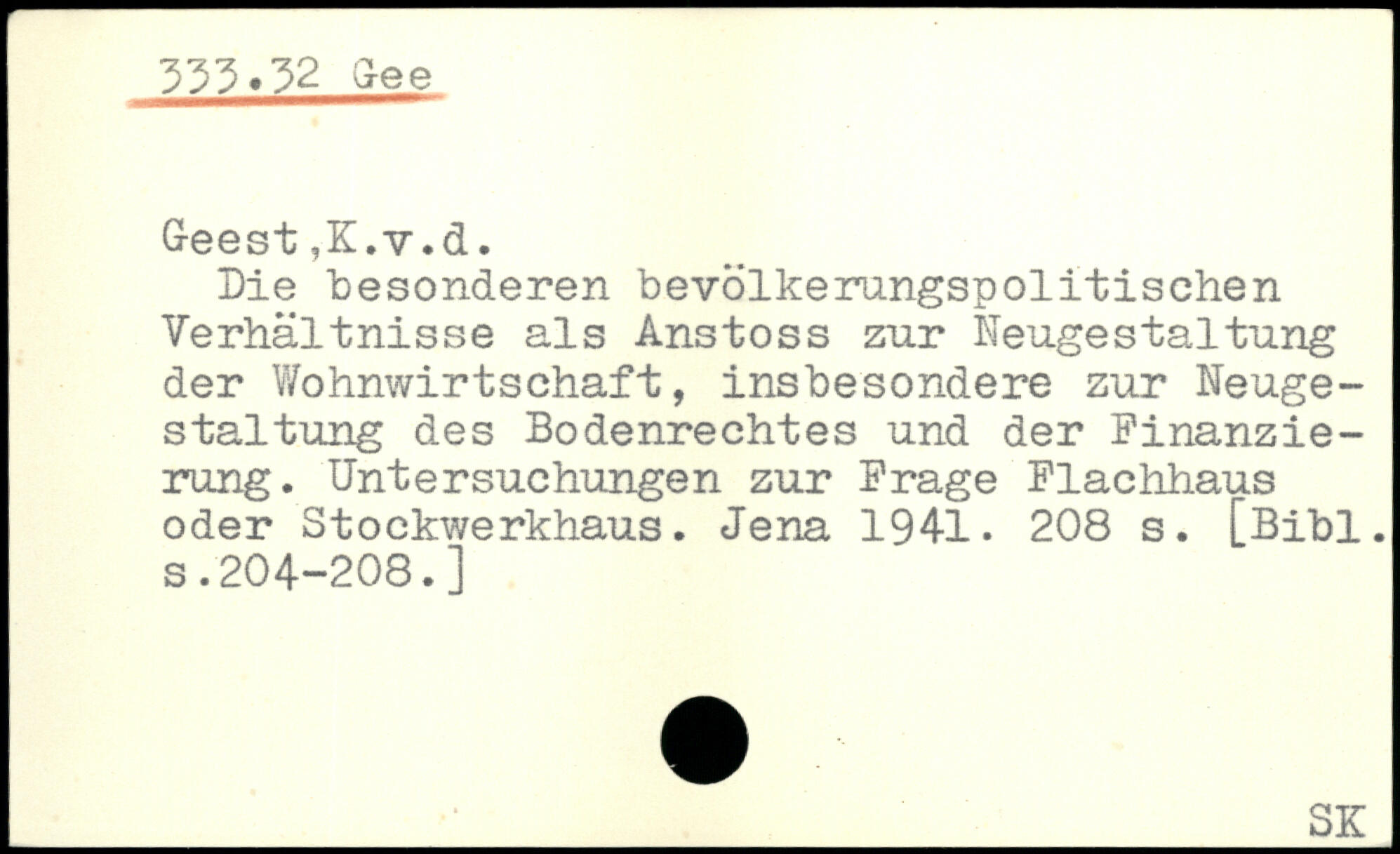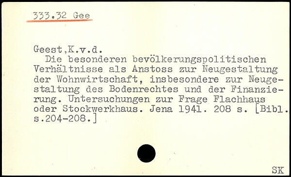 Die besonderen bevölkerungspolitischen Verhältnisse als Anstoss zur Neugestaltung der Wohnwirtschaft, insbesondere zur Neugestaltung des Bodenrechtes und der Finanzierung. Untersuchungen zur Frage Flachhaus oder Stockwerkhaus. Jena 1941.