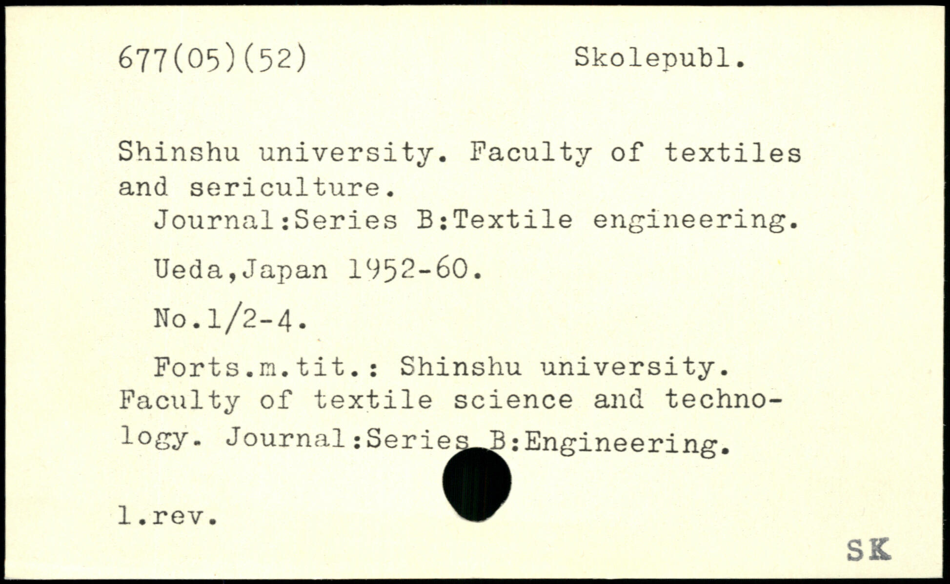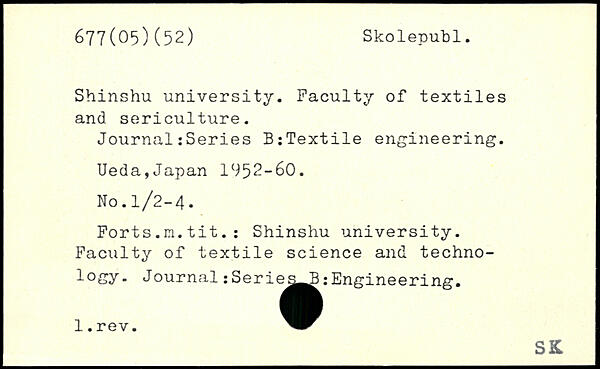 Shinshu university. Faculty of textiles and sericulture. Journal iSeries BiTextile engineering. Ueda,Japan 1952-60. No.1/2-4. Forts.m.tit.: Shinshu university. Faculty of textile science and techno-lo&y- Journal:Series^B:Engineering. l.rev.