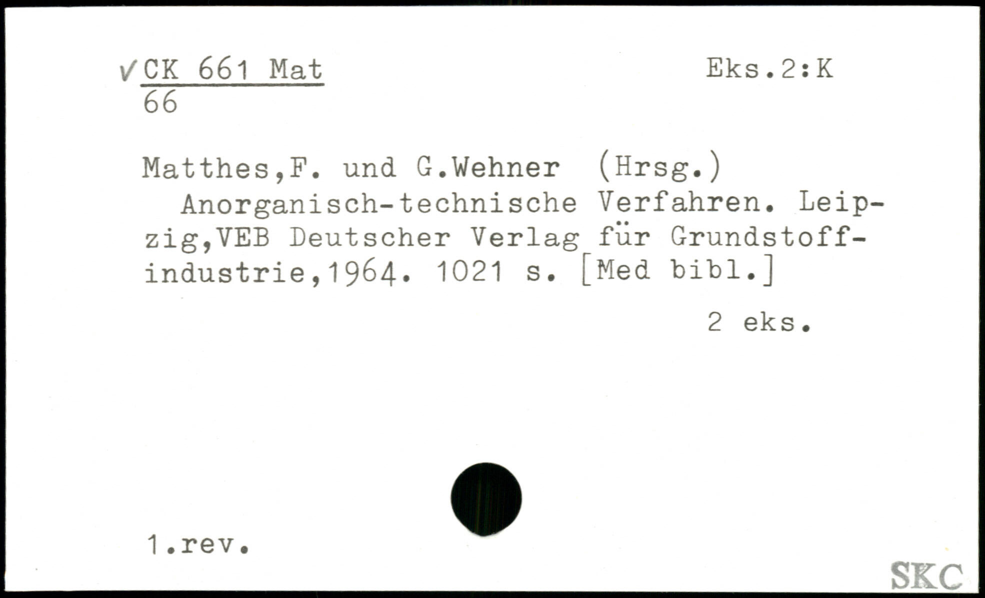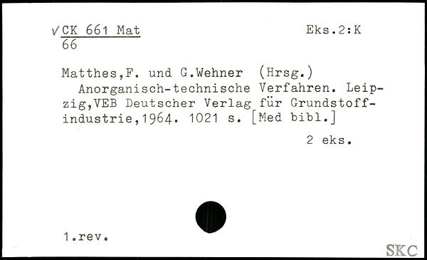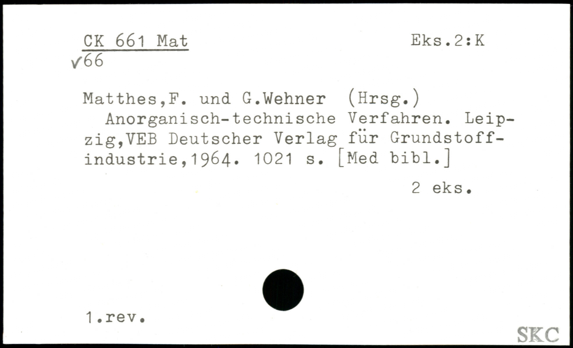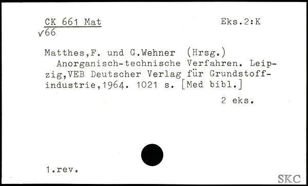Anorganisch-technische Verfahren. Leipzig,VEB Deutscher Verlag für Grundstoffindustrie , 1964.