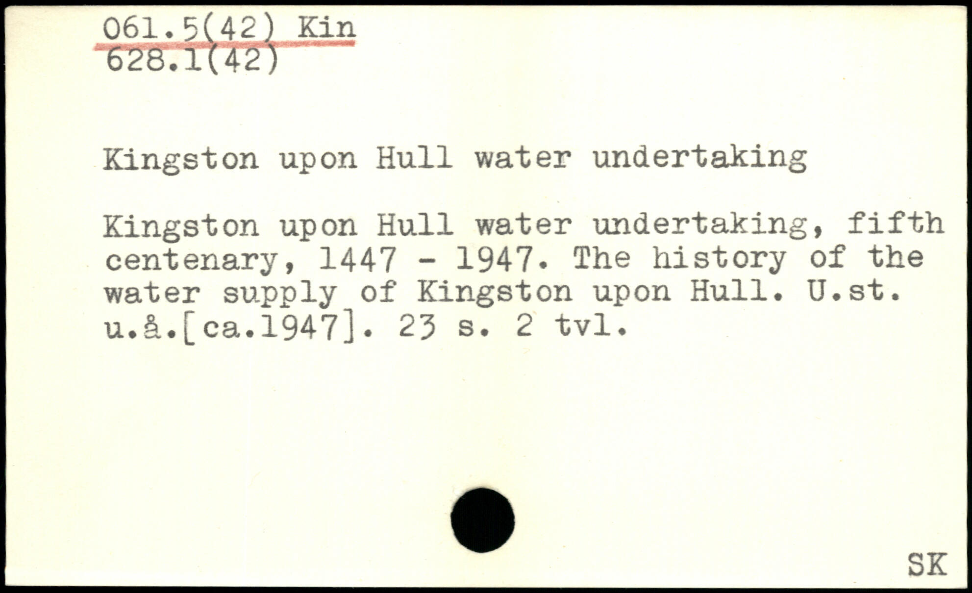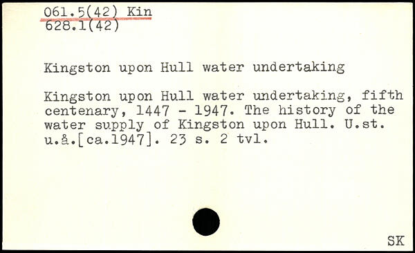 fe^.rRsn Kingston upon Hull water undertaking Kingston upon Hull water undertaking, fifth centenary, 1447 - 1947. The history of the water supply of Kingston upon Hull. U.st. u.s.[ca.1947].