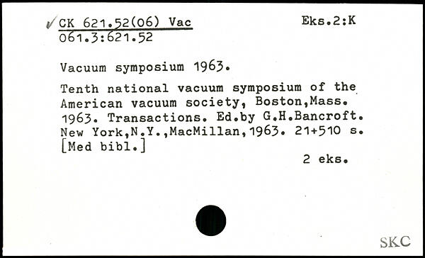 Vacuum symposium 19&3. Tenth national vacuum symposium of the American vacuum society, Boston,Mass. 1963. Transactions. Ed.by G,H.Bancroft. New York,N.Y.,MacMillan,19&3