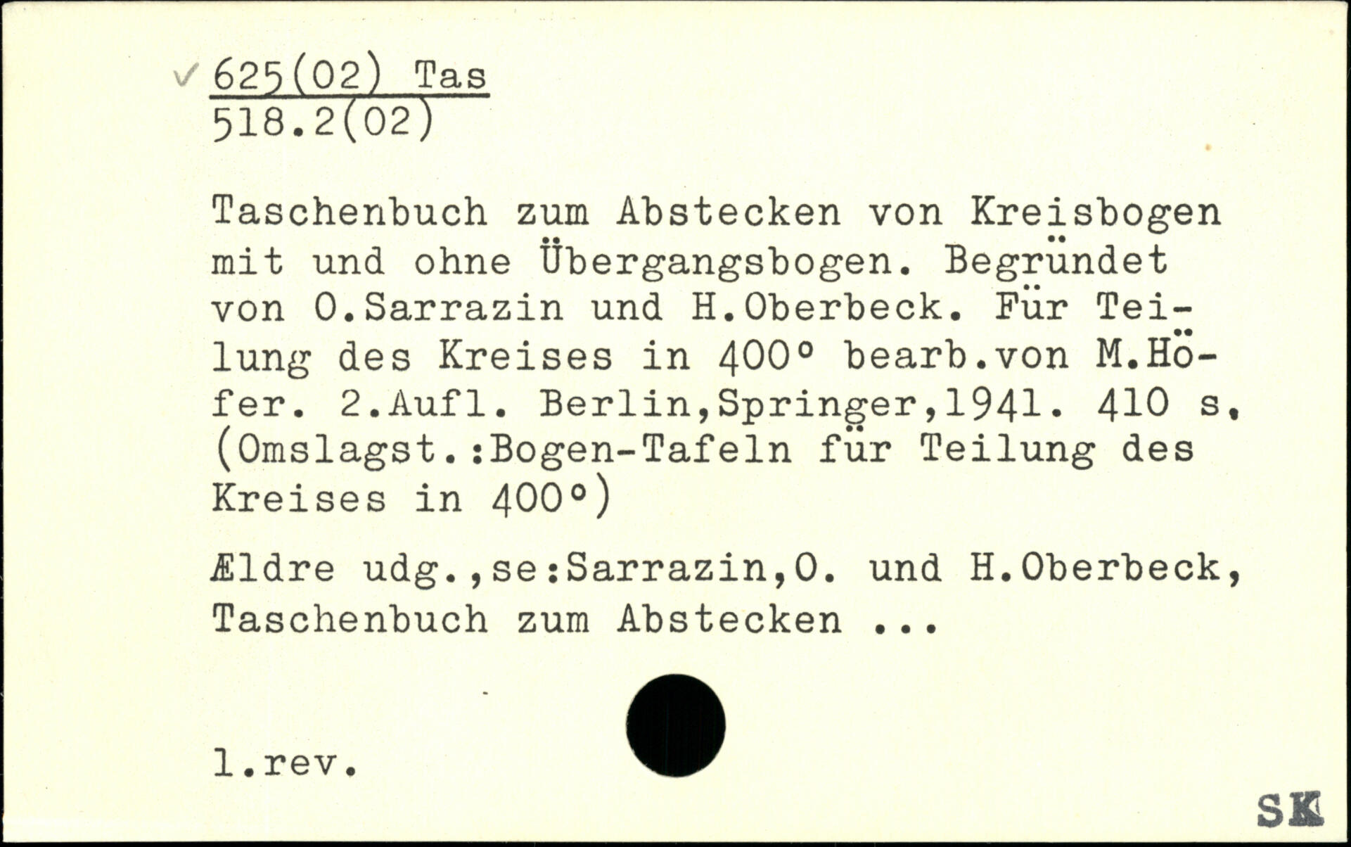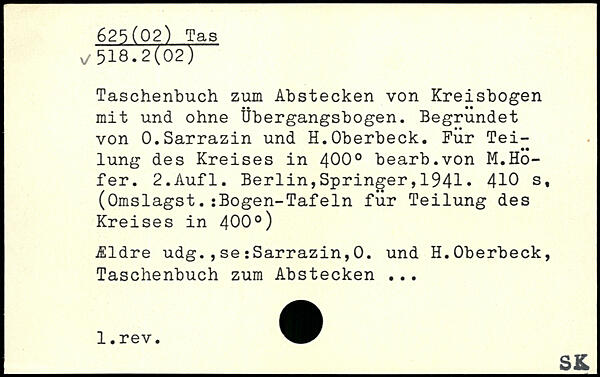 Taschenbuch zum Abstecken von Kreisbogen mit und ohne Übergangsbogen. Begrundet von 0.Sarrazin und H.Oberbeck. Für Teilung des Kreises in 400. bearb.von M.Hofer.
