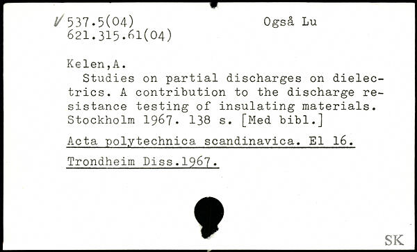 Studies on partial discharges on dielectrics. A contribution to the discharge resistance testing of insulating materials.