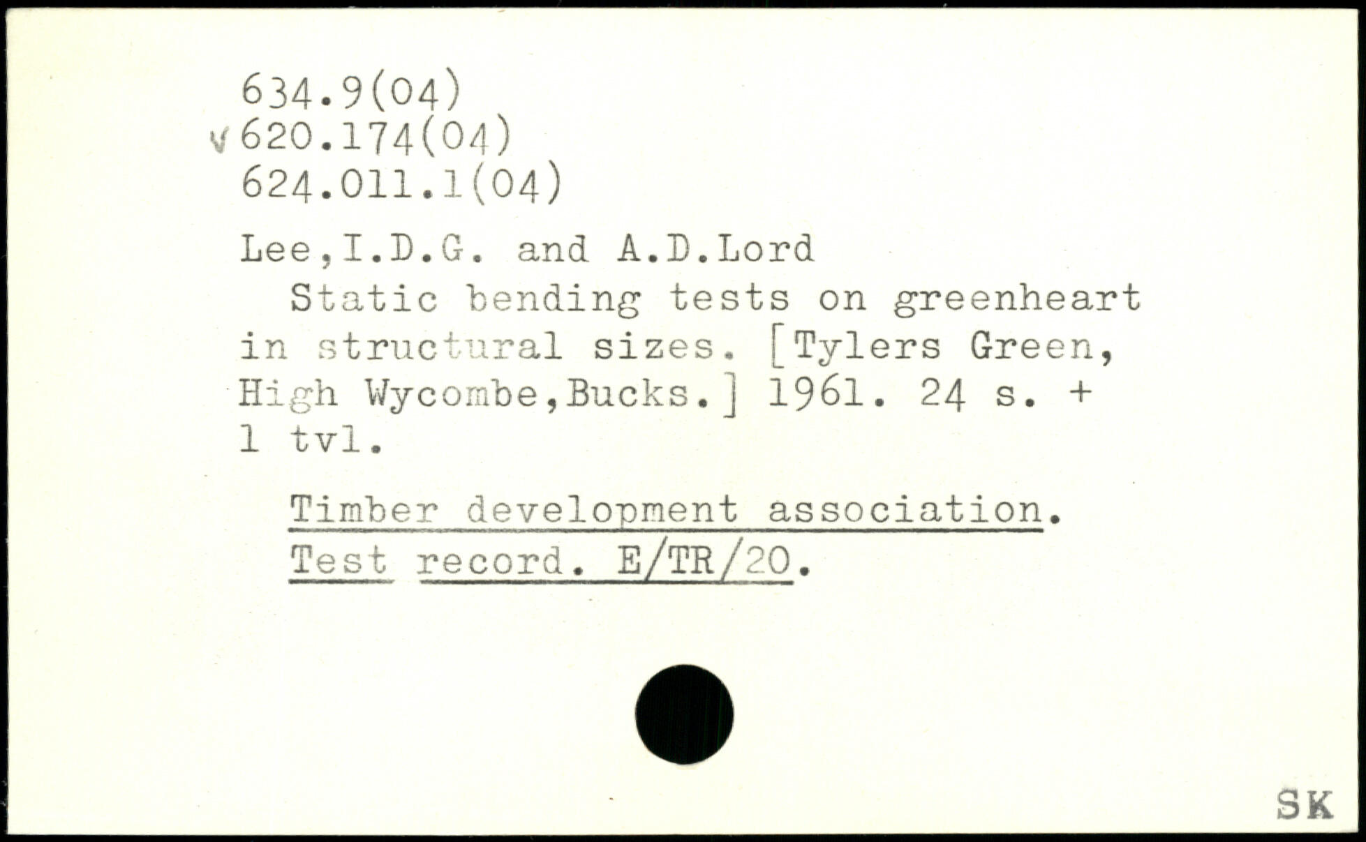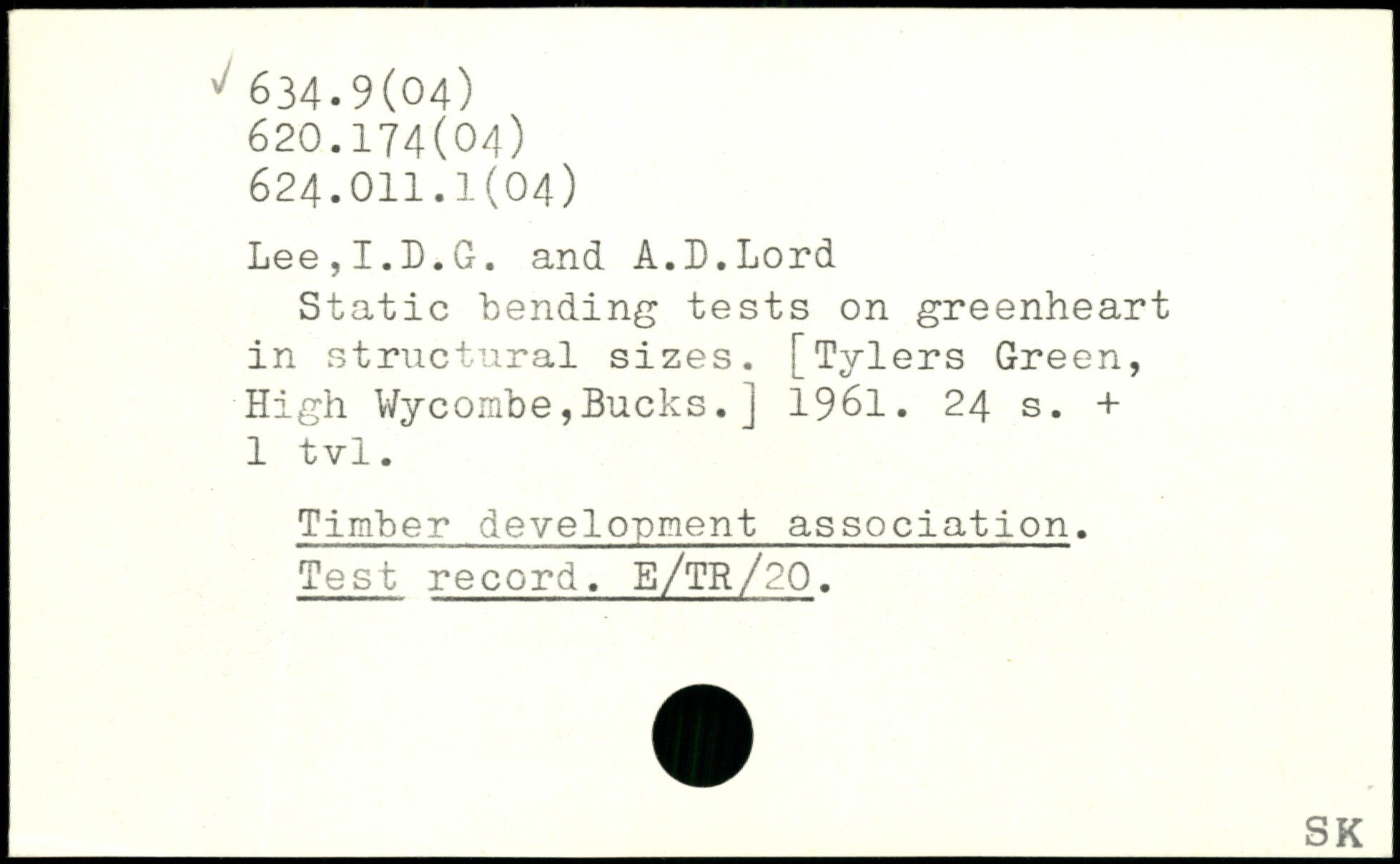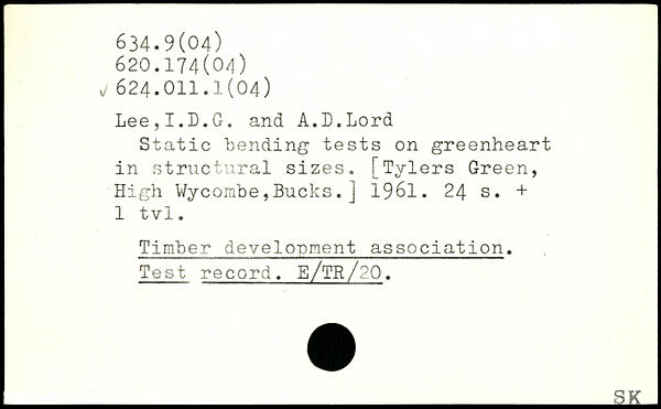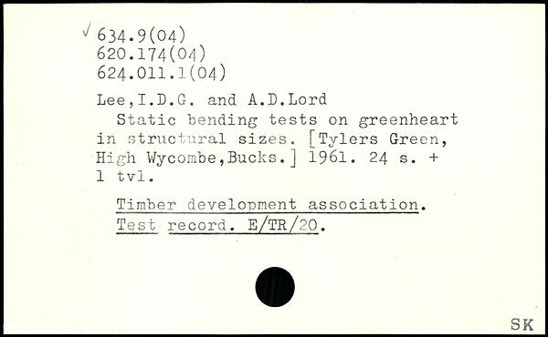 Static bending tests on greenheart in structural sizes. [Tylers Green, High Wycombe,Bucks.j 1961.