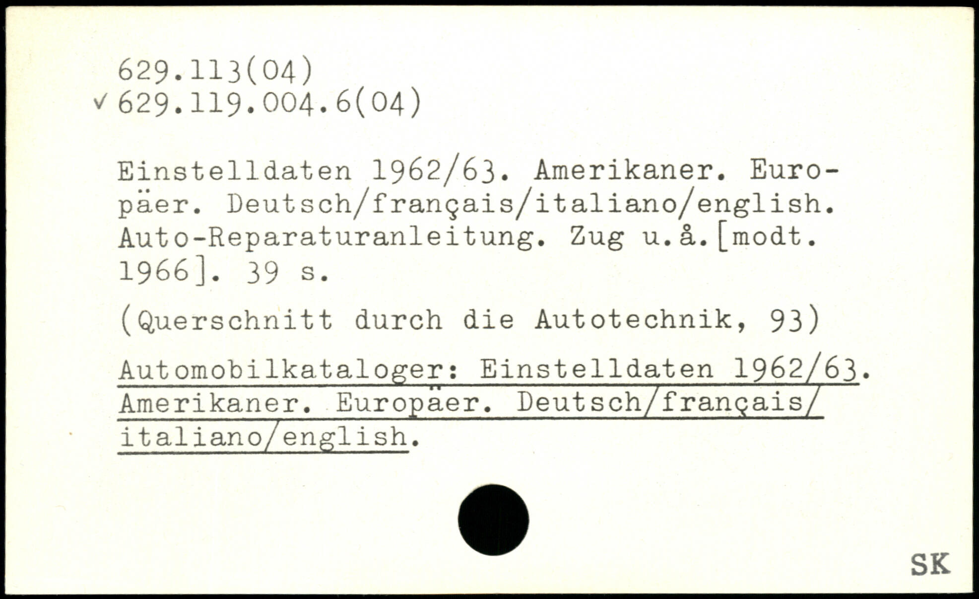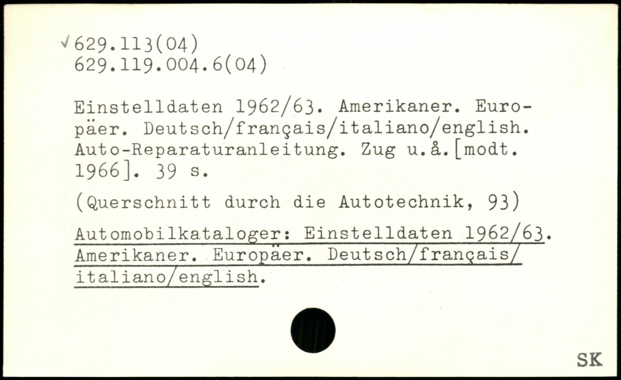 Einstelldaten 1962/63. Amerikaner. Europäer. Deutsch/français/italiano/english. Auto-Reparaturanleitung. Zug u.a.[modt. 1966].