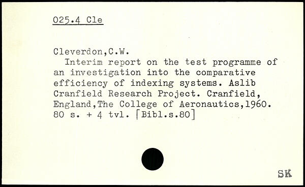 Interim report on the test programme of an investigation into the comparative efficiency of indexing systems. Aslib Cranfield Research Project.