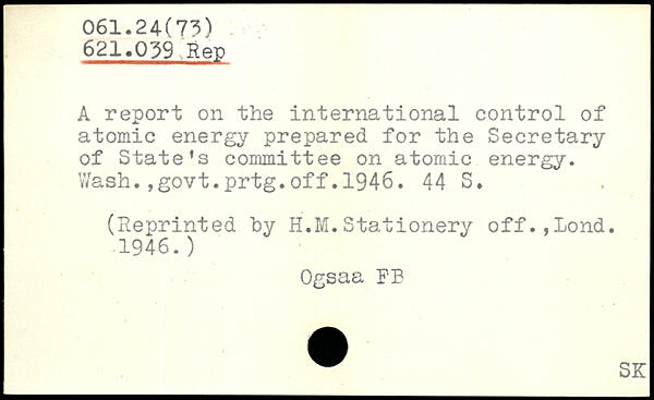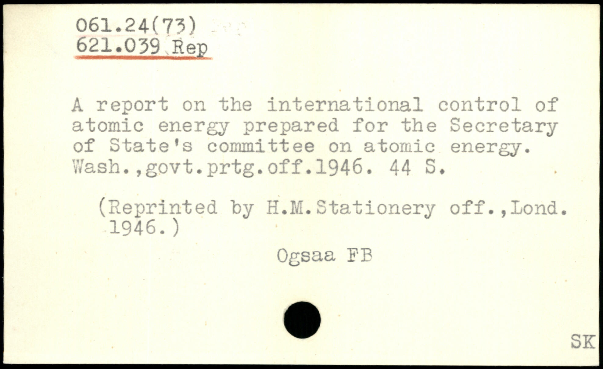 A report on the international control of atomic energy prepared for the Secretary of State's committee on atomic energy. Wash.,govt.prtg.off.1946.