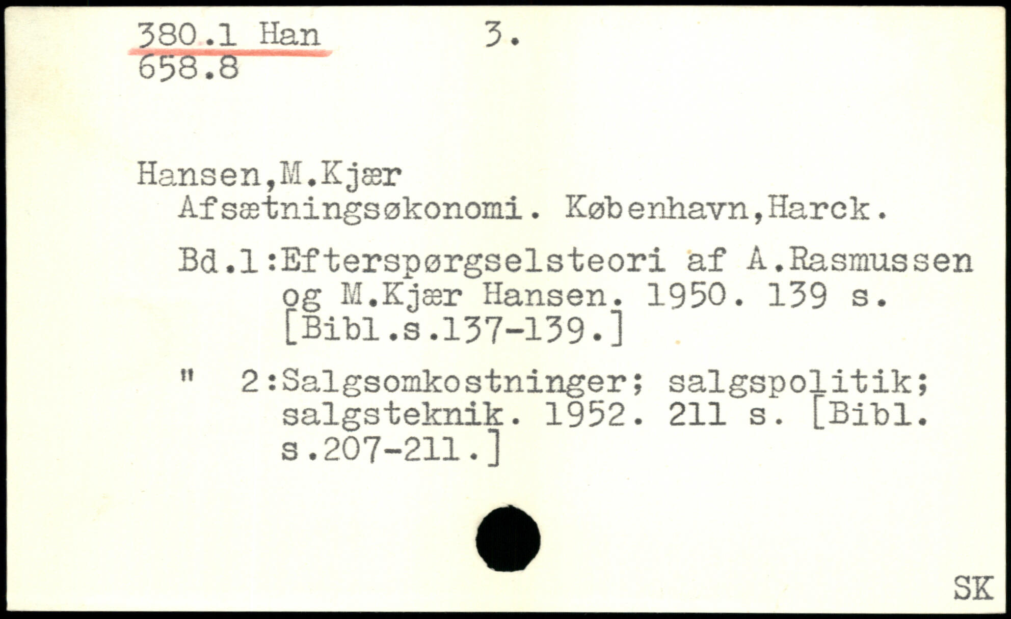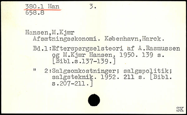 Hansen,M.Kjær Afsætningsøkonomi. København,Harek. Bd.l:Efterspørgselsteori af A.Rasmussen og M.Kjær Hansen. 1950.