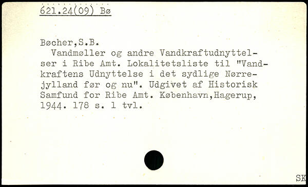 Vandmøller og andre Vandkraftudnyttelser i Rite Amt. Lokalitetsliste til "Vandkraftens Udnyttelse i det sydlige Nørrejylland før og nu". Udgivet af Historisk Samfund for Ribe Amt.