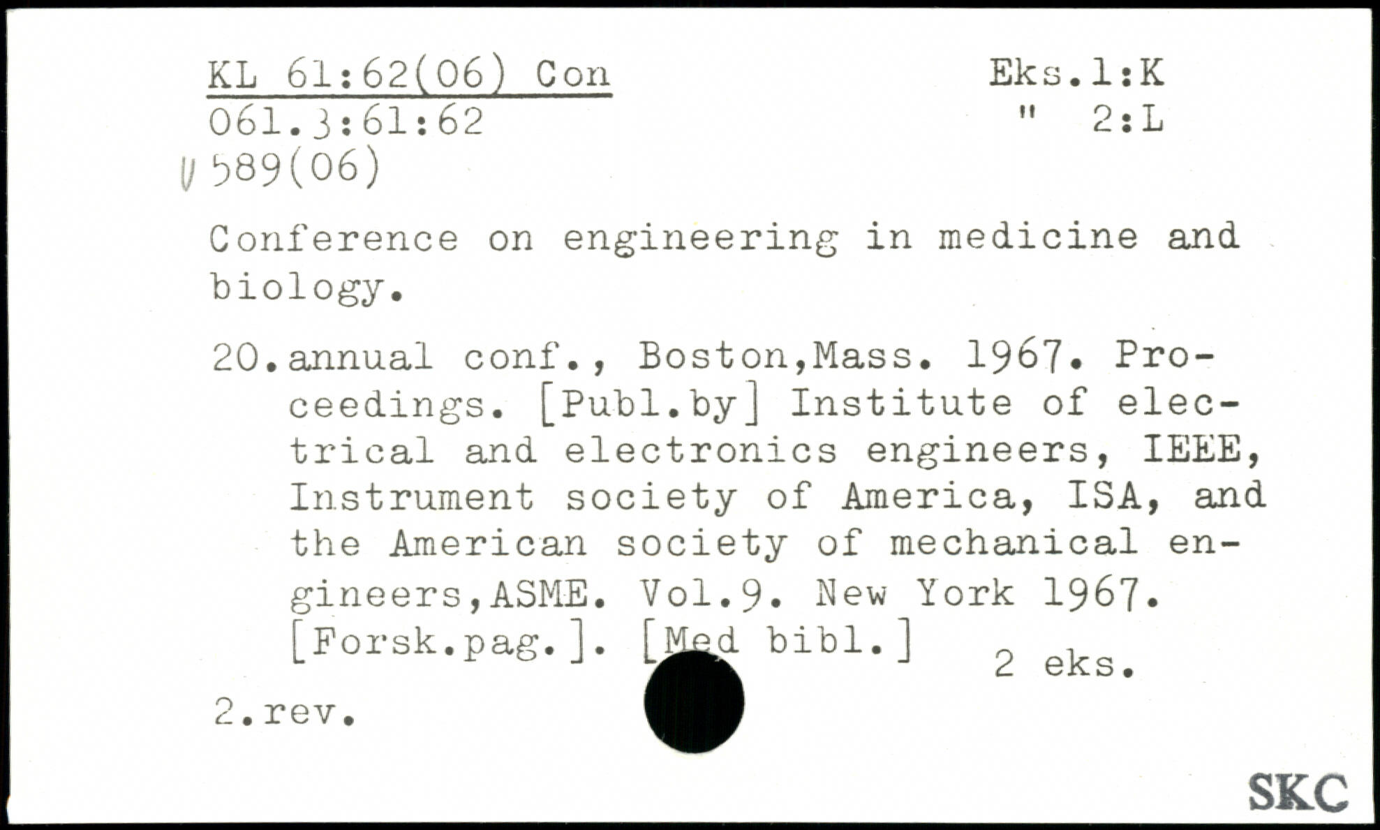 Conference on engineering in medicine and biology. 20.annual conf., Boston,Mass. 196?. Proceedings.