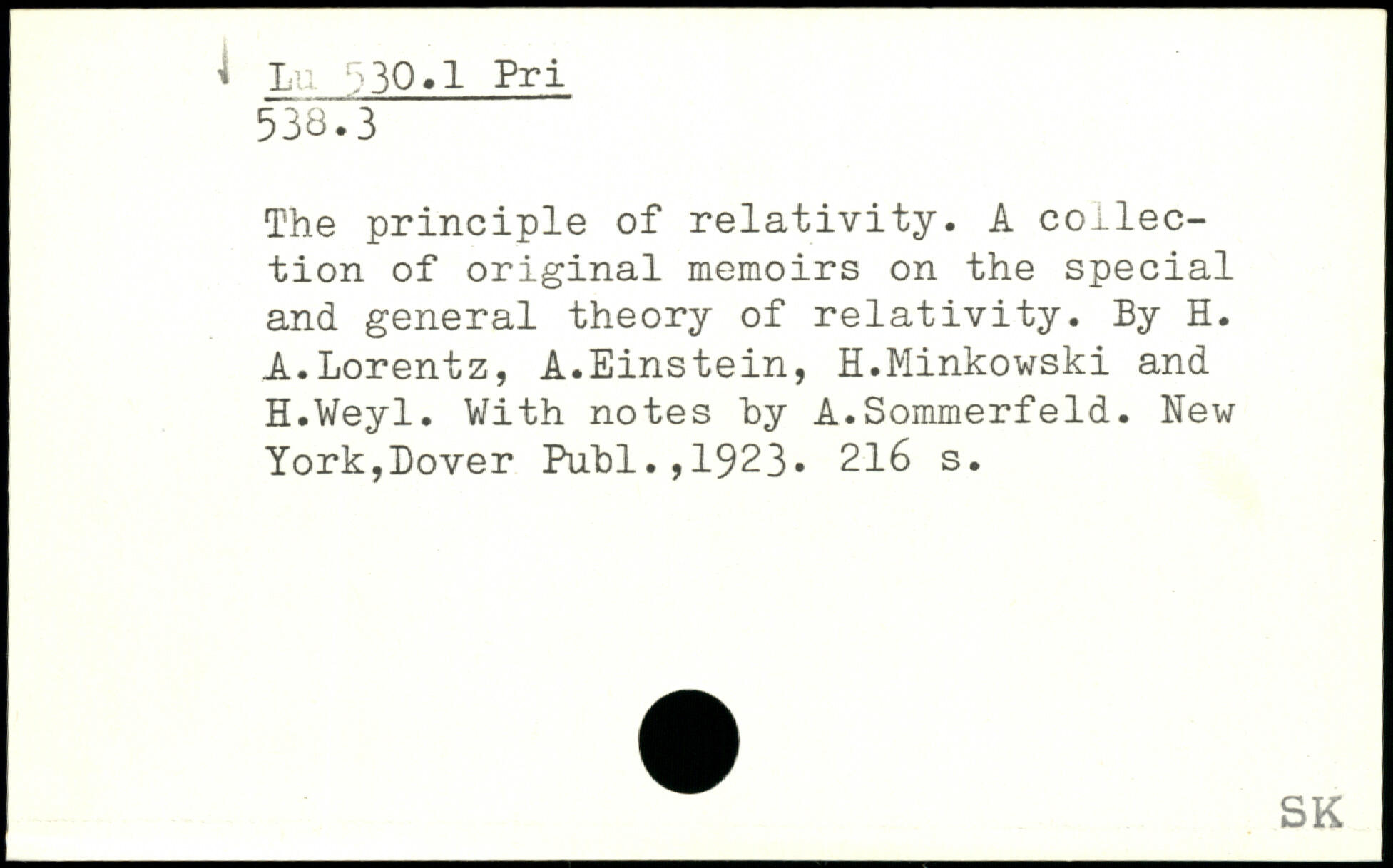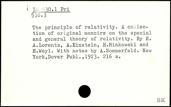 The principle of relativity. A collection of original memoirs on the special and general theory of relativity. By H. A.Lorentz, A.Einstein, H.Minkowski and H.Veyl. With notes by A.Sommerfeld.