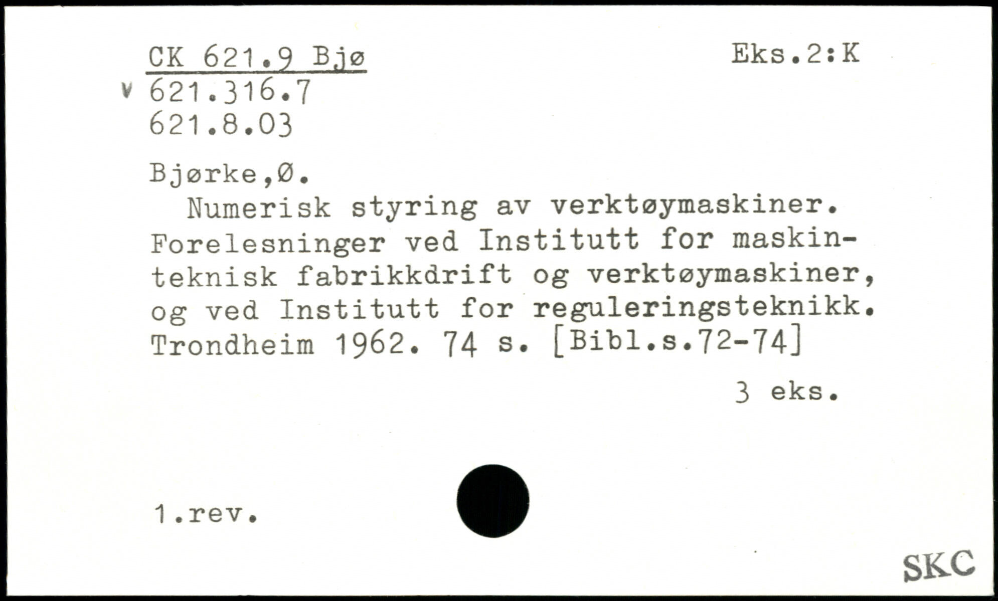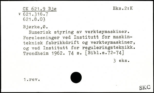 Numerisk styring av verktoymaskiner. Forelesninger ved Institutt for maskinteknisk fabrikkdrift og verktoymaskiner, og ved Institutt for reguleringsteknikk.