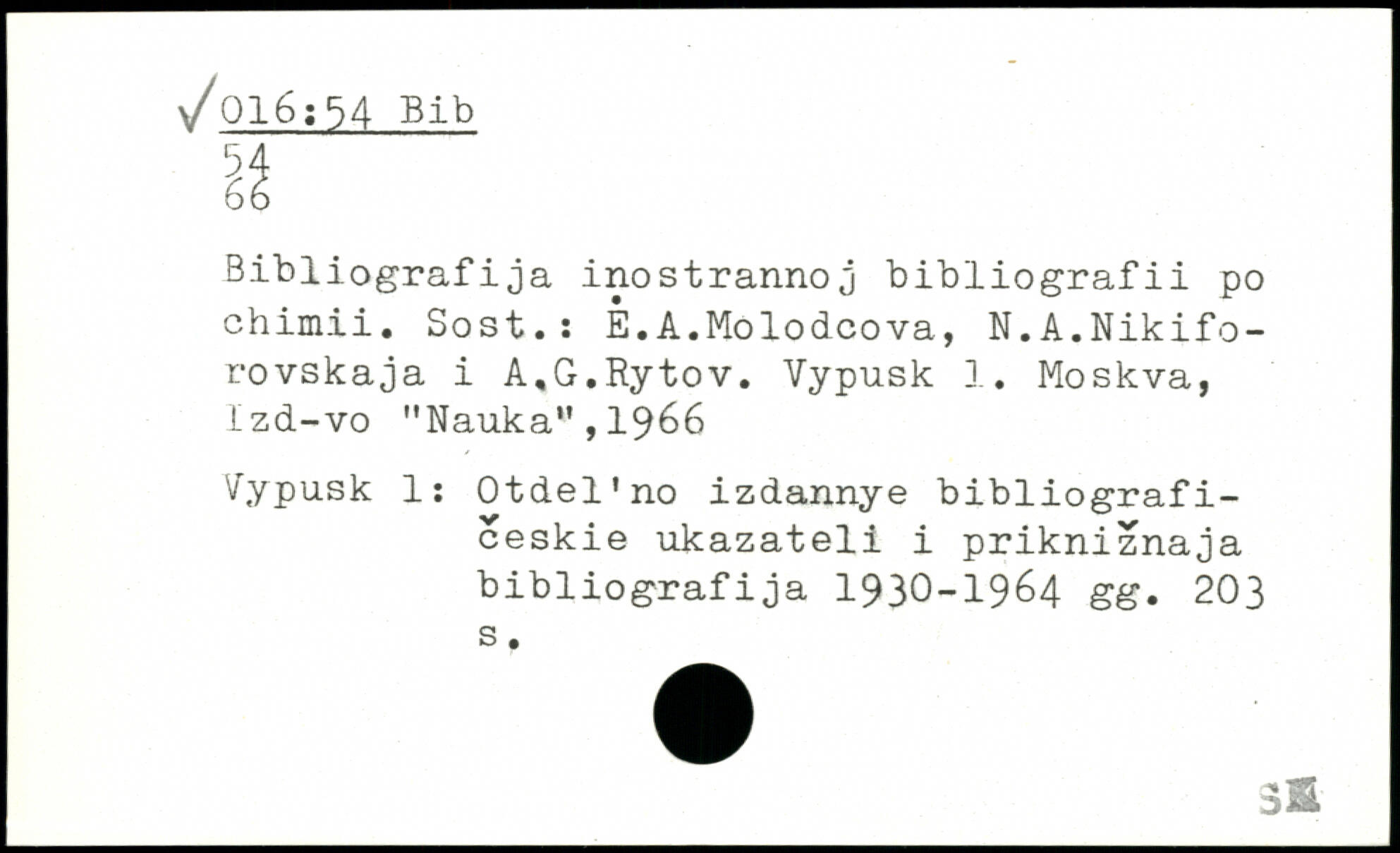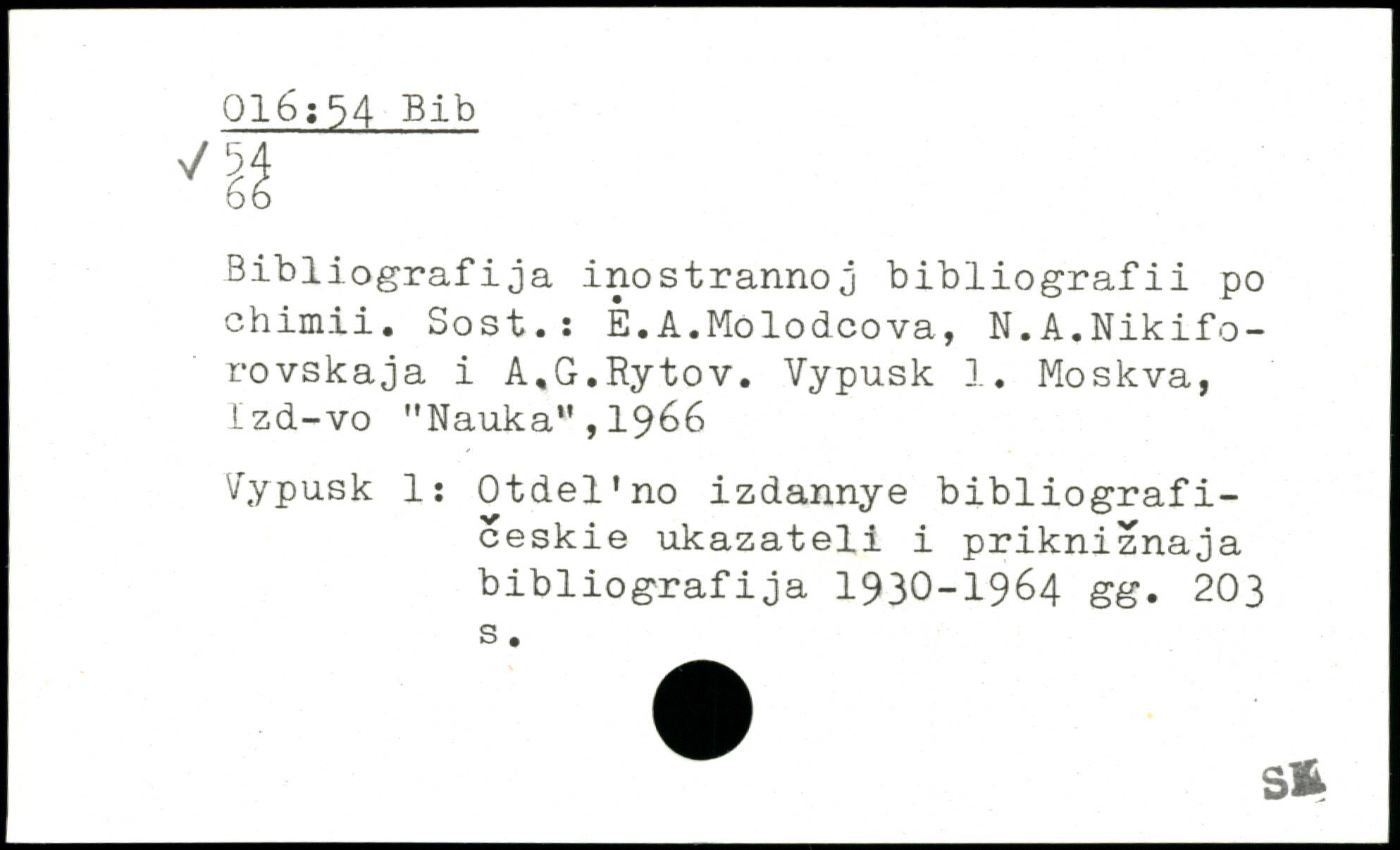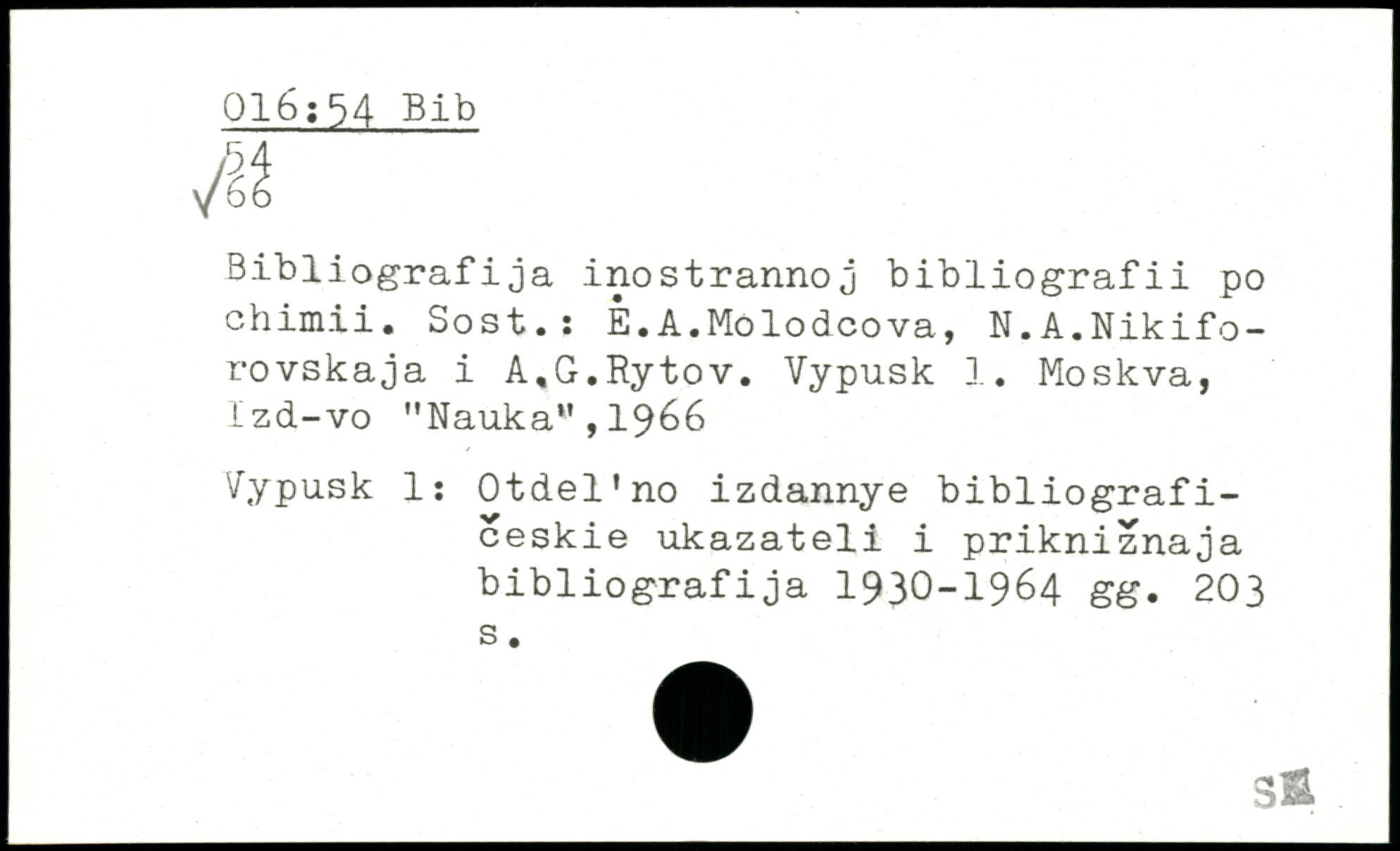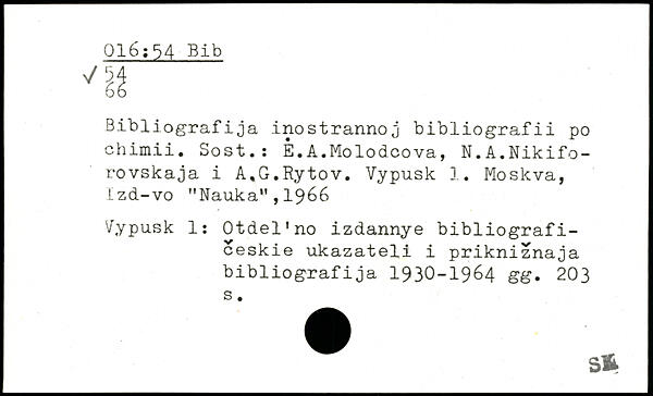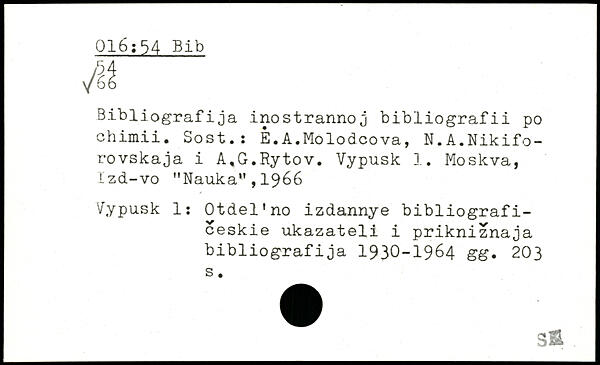 Bibliografija inostrannoj bibliografii po chimii. Sost.î Ê.A.Molodcova, N.A.Nikifo-rovskaja i A.G.Rytov. Vypusk 1. Moskva, Izd-vo "Nauka",1966 Vypusk 1: Otdel’no izdannye bibliografi-ceskie ukazateli i prikniznaja bibliografija 1930-1964 gg.
