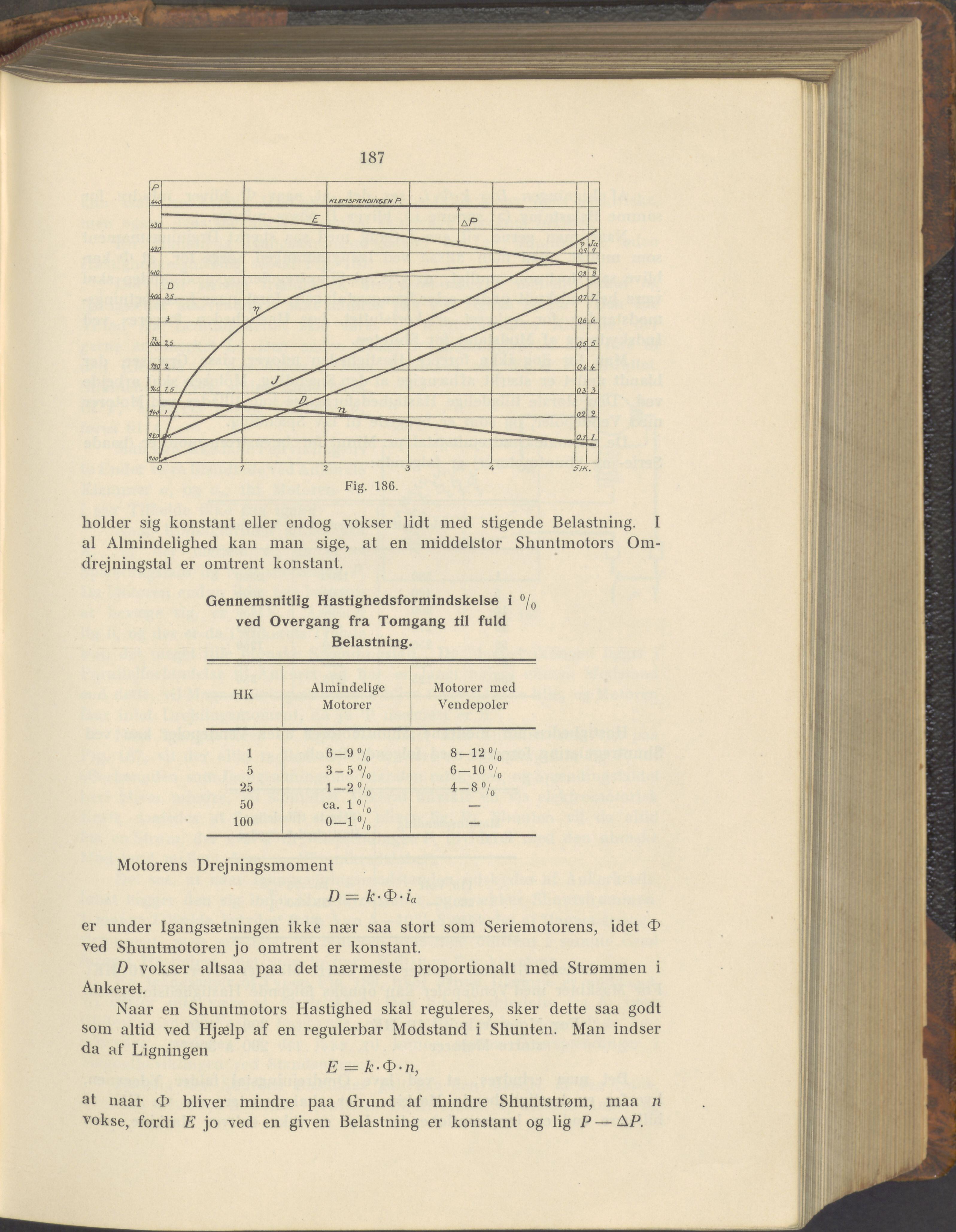 187 holder sig konstant eller endog vokser lidt med stigende Belastning. I al Almindelighed kan man sige, at en middelstor Shuntmotors Om- drejningstal er omtrent konstant. Gennemsnitlig Hastighedsformindskelse i °/0 ved Overgang fra Tomgang til fuld Belastning. HK Almindelige Motorer Motorer med Vendepoler 1 6-9% 8-12% 5 3-5% 6-10 »/o 25 1-2 °/0 4-8 o/o 50 ca. 1 °/0 — 100 0-17o — Motorens Drejningsmoment D — k • 0 • i a er under Igangsætningen ikke nær saa stort som Seriemotorens, idet 0 ved Shuntmotoren jo omtrent er konstant. D vokser altsaa paa det nærmeste proportionalt med Strømmen i Ankeret. Naar en Shuntmotors Hastighed skal reguleres, sker dette saa godt som altid ved Hjælp af en regulerbar Modstand i Shunten. Man indser da af Ligningen E = k-Q-n, at naar bliver mindre paa Grund af mindre Shuntstrøm, maa n vokse, fordi E jo ved en given Belastning er konstant og lig P — AP.