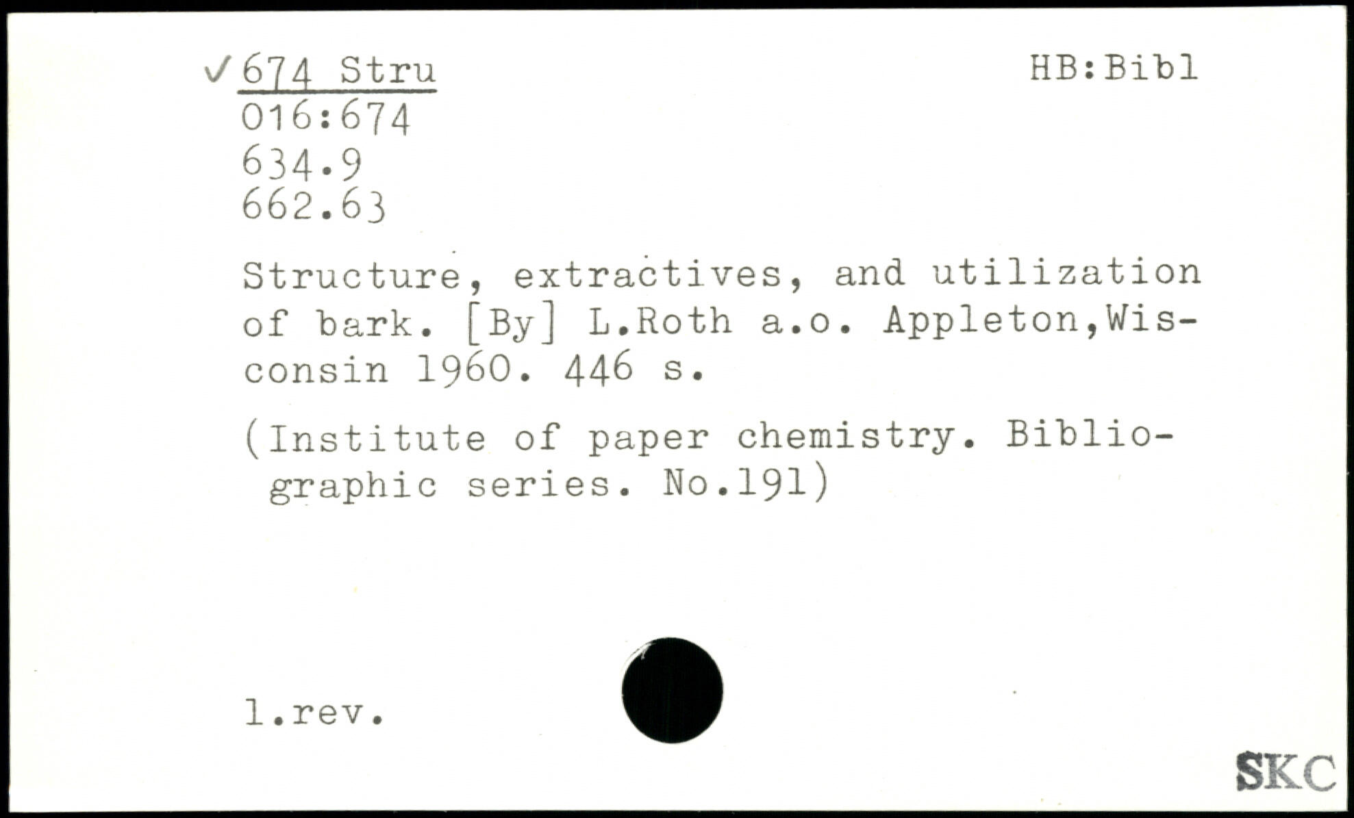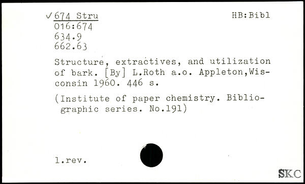 Structure, extractives, and utilization of bark. [By] L.Roth a.o. Appleton,Wisconsin 1960.