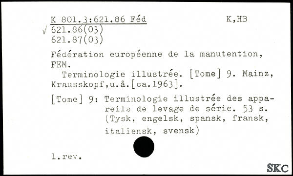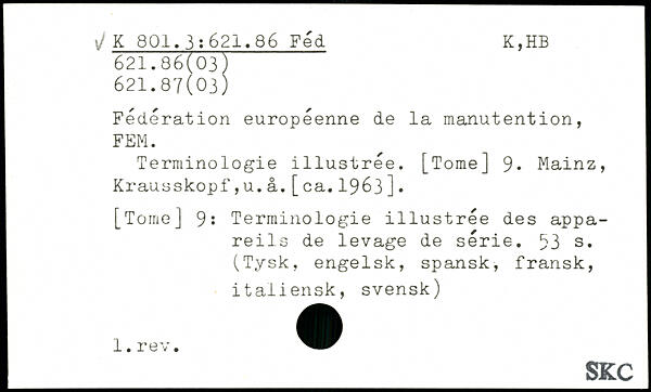 Fédération européenne de la manutention, FEM. Terminologie illustrée. [Tome] 9, Mainz, Krausskopf,u.à.[ca.1963].