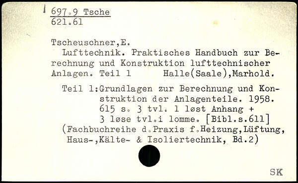 Lufttechnik. Praktisches Handbuch zur Berechnung und Konstruktion lufttechnischer Anlagen. Teil 1 Halle(Saale),Marhold. Teil 1:Grundlagen zur Berechnung und Konstruktion der Anlagenteile. 1958