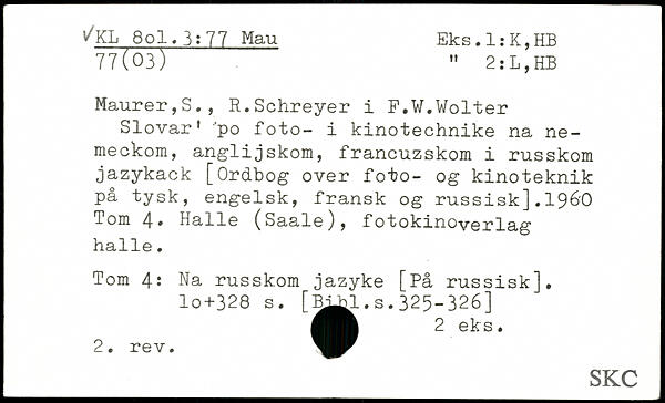 Slovar' ?po foto- i kinotechnike na ne-meckom, anglijskom, francuzskom i russkom jazykack [Ordbog over foto- og kinoteknik på tysk, engelsk, fransk og russisk].19&0 Tom 4, Halle (Saale), fotokinoverlag halle. Tom 4: Na russkom jazyke [På russisk], lo