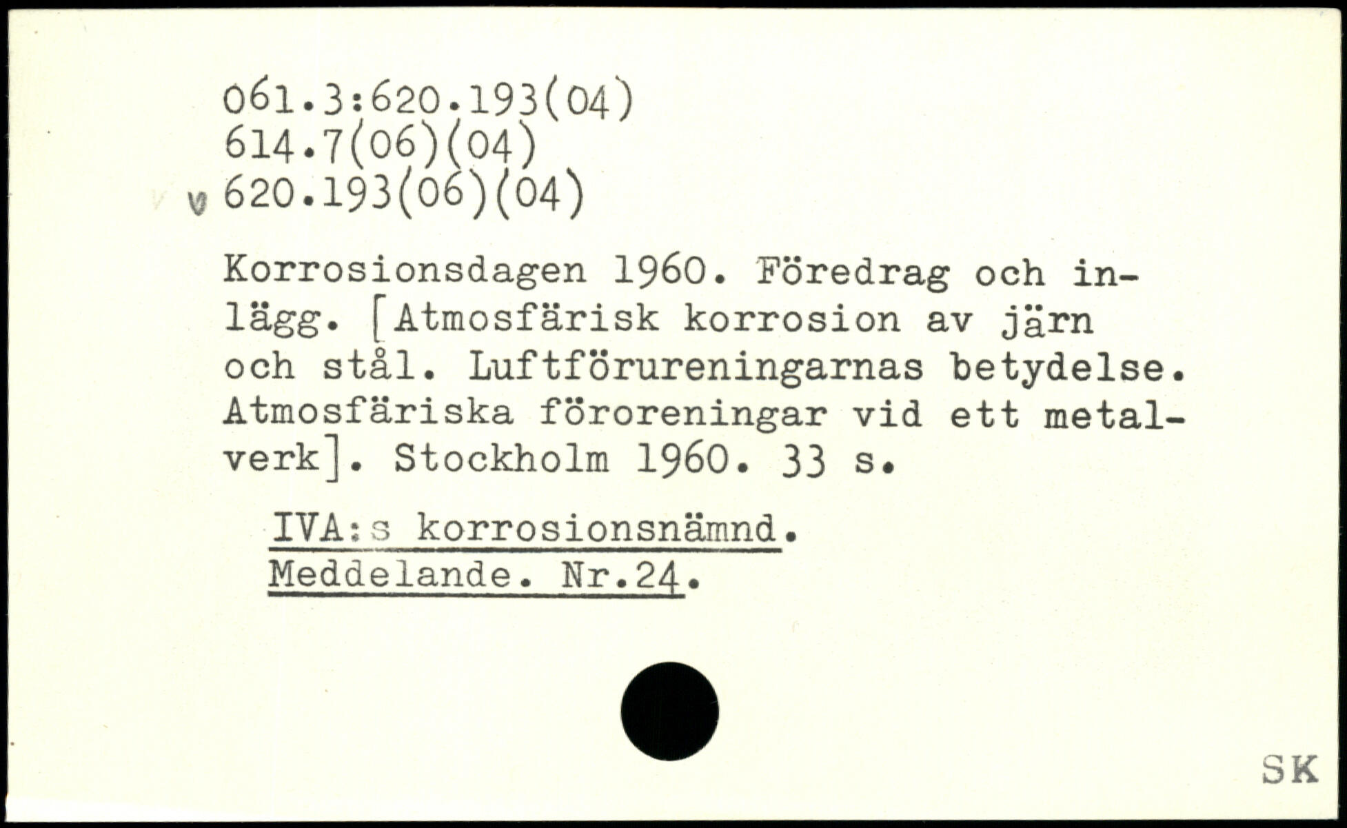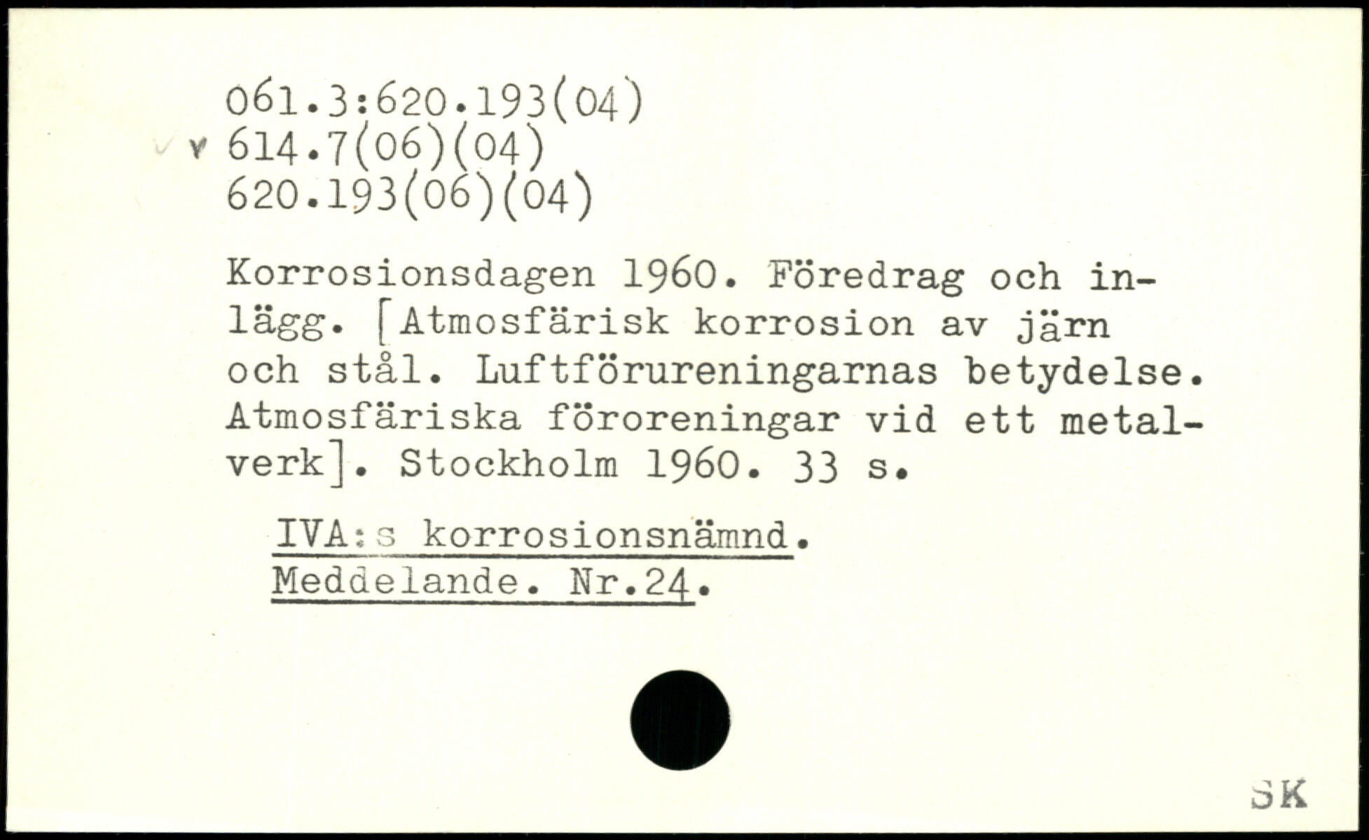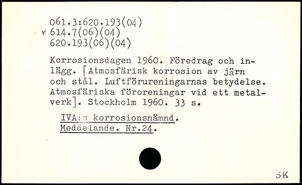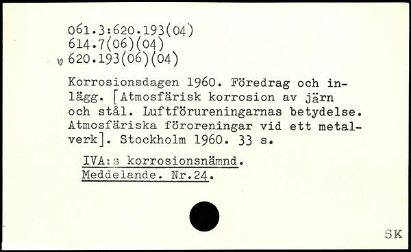 Korrosionsdagen 1960. Föredrag och inlägg. [Atmosfärisk korrosion av järn och stål. Luftförureningarnas betydelse. Atmosfäriska föroreningar vid ett metal-verk].