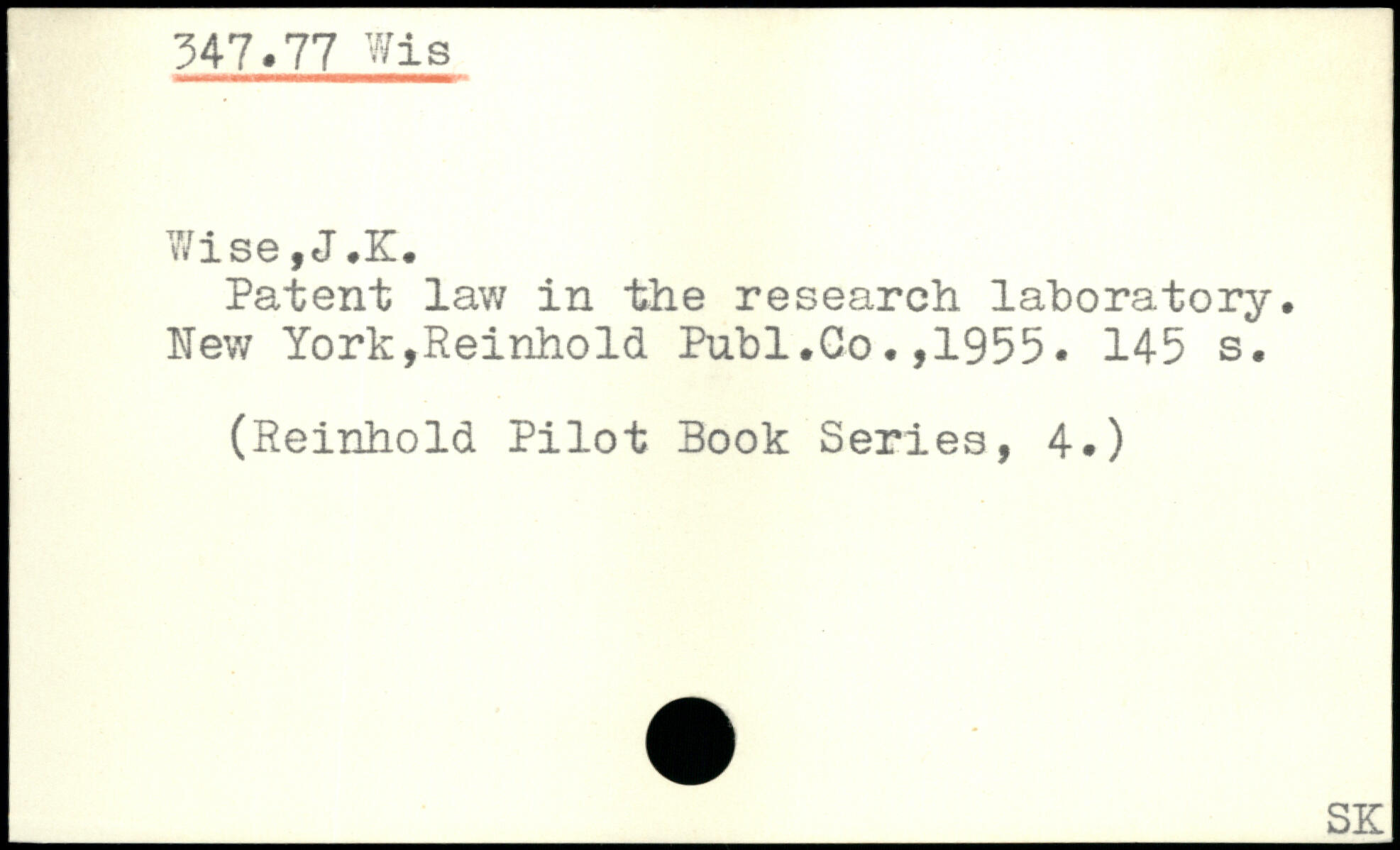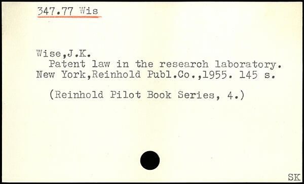 Patent law in the research laboratory. New York,Reinhold Publ.Go.,1955.