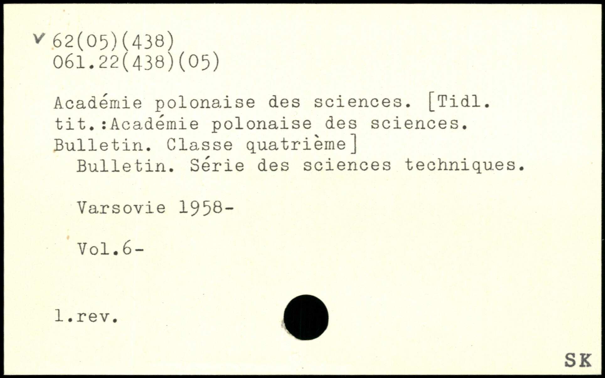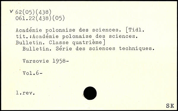 Académie polonaise des sciences. [Tidl. tit.: Académie polonaise des sciences. Bulletin. Classe quatrième] Bulletin. Série des sciences techniques. Varsovie 1958-