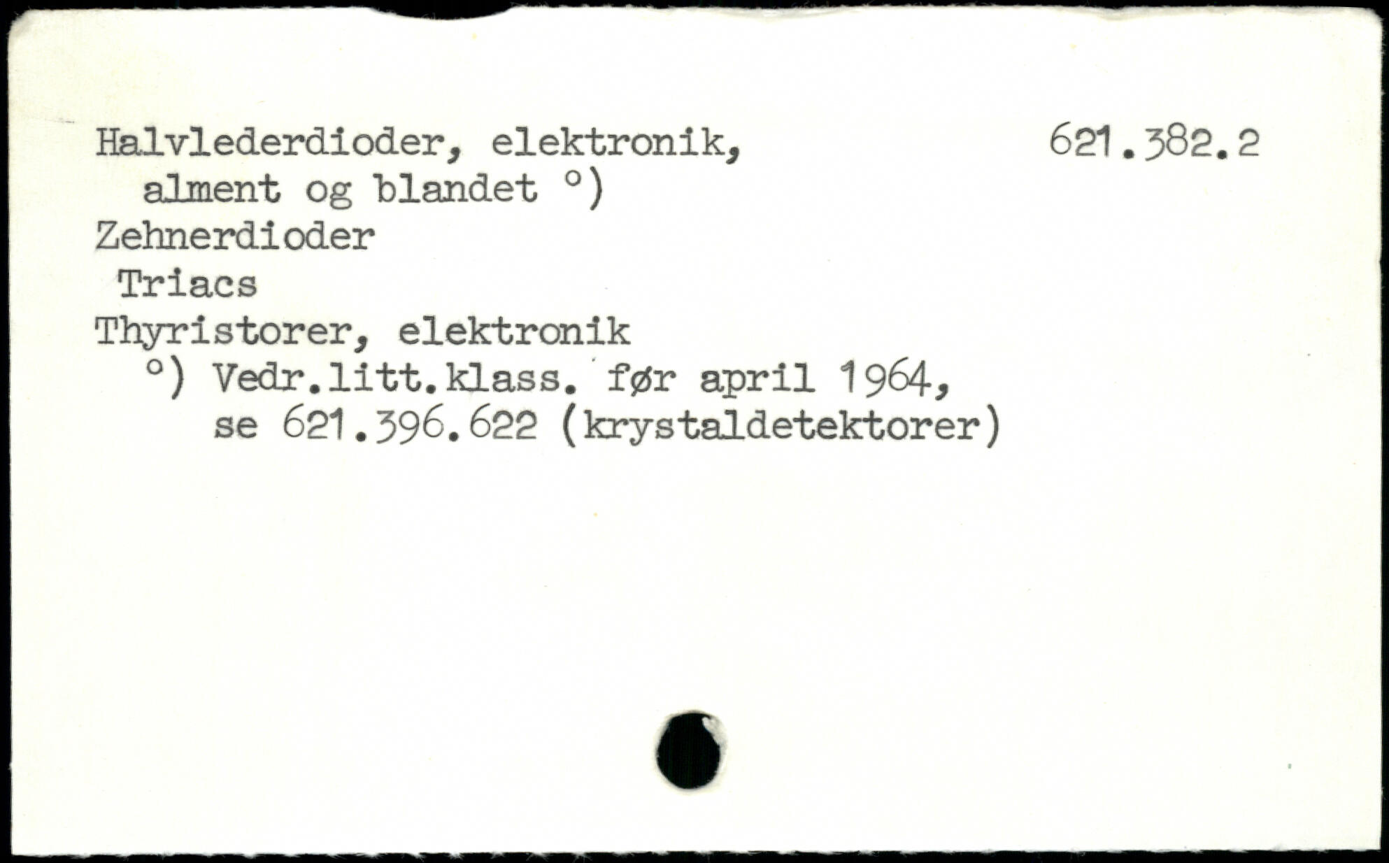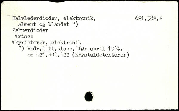 Halvlederdioder, elektronik, 621.382.2 alment og "blandet .) Zehnerdioder Triacs Thyristorer, elektronik .) Vedr.litt.klass. før april 1964-. se 621.396.622 (krystaldetektorer)