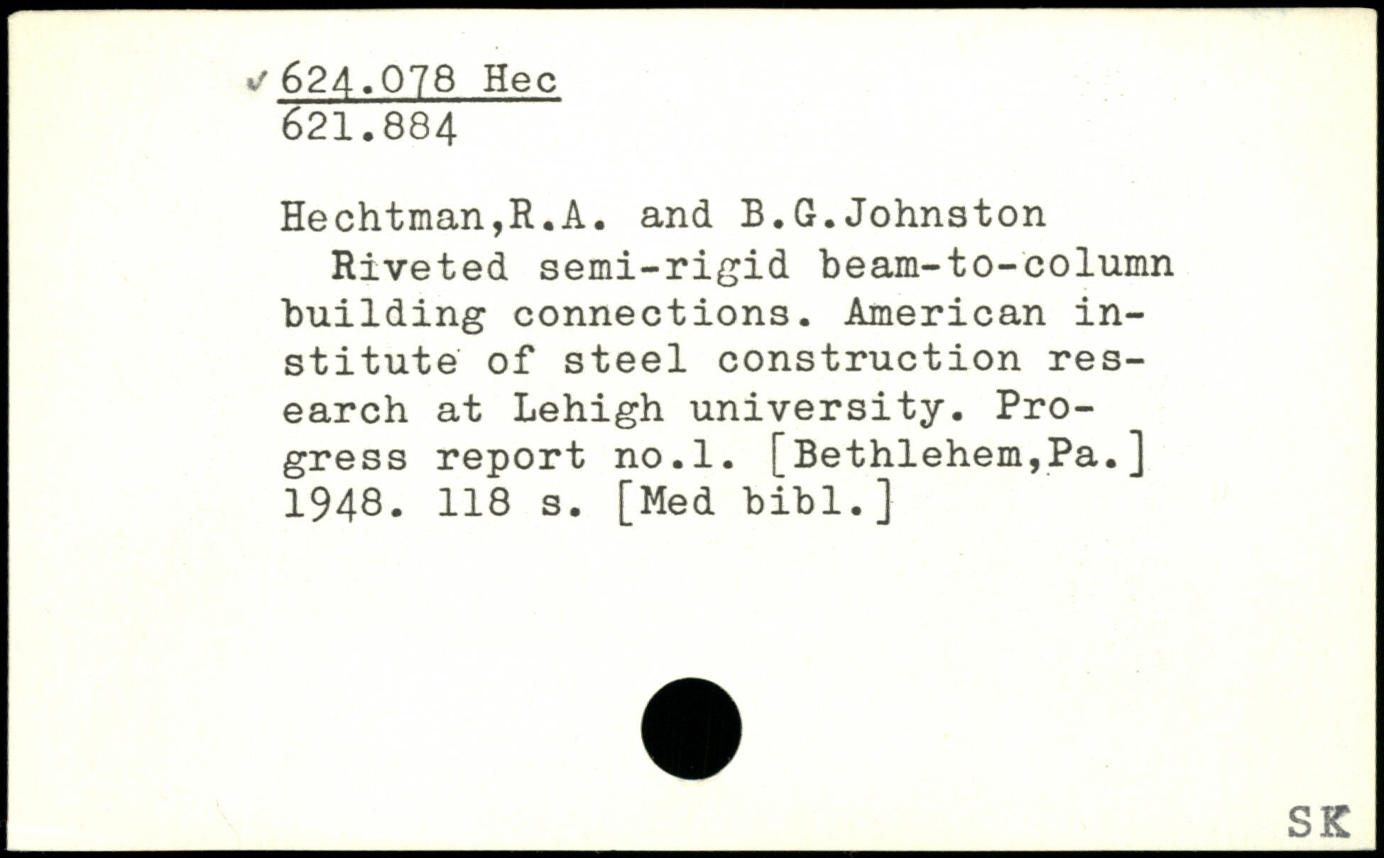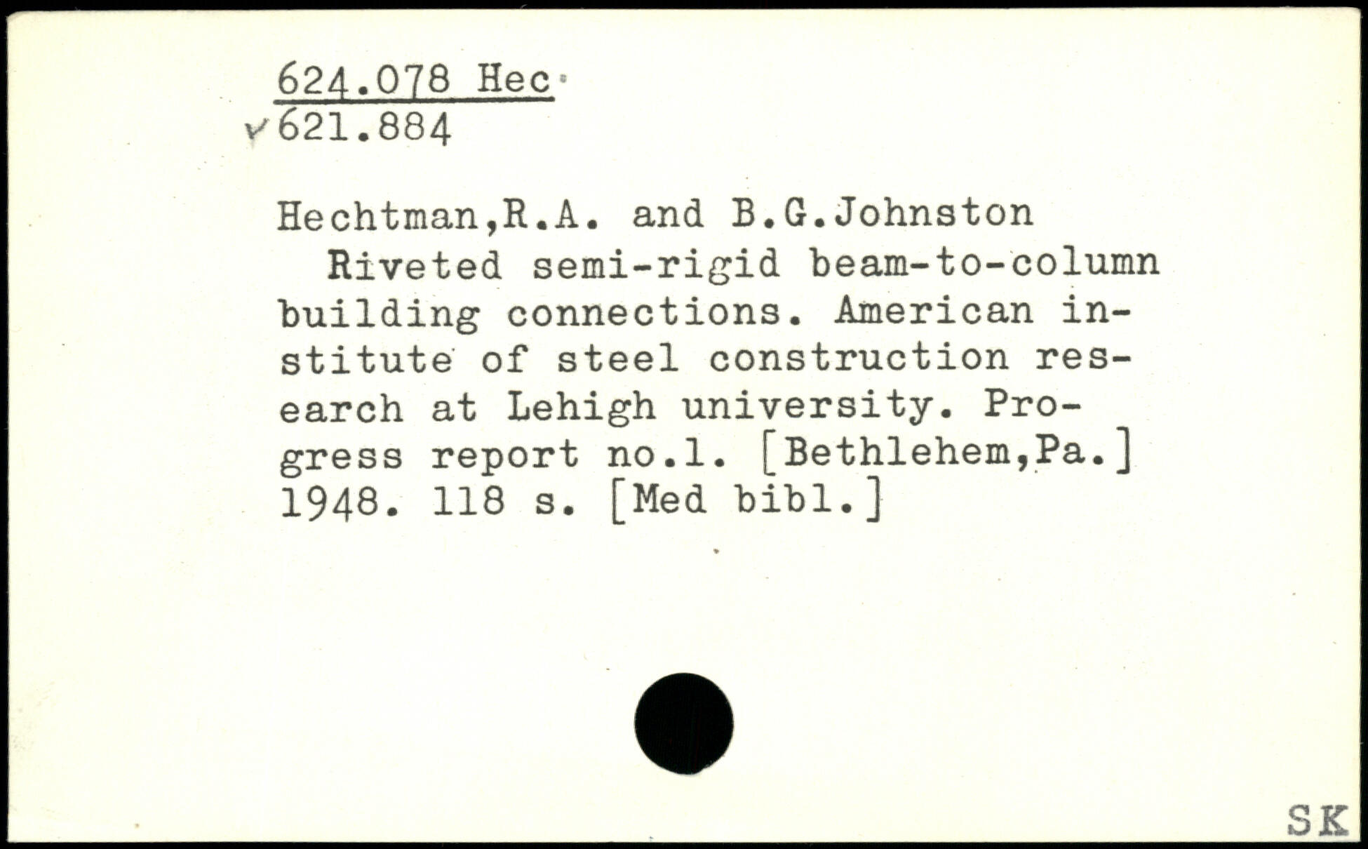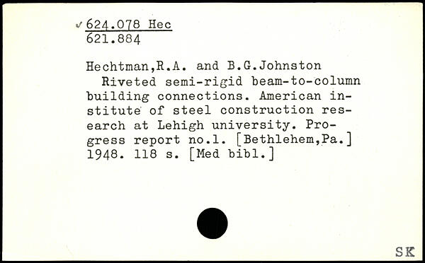 Riveted semi-rigid beam-to-column building connections. American institute of steel construction research at Lehigh university. Progress report no.l. [Bethlehem,Pa.] 1948- H