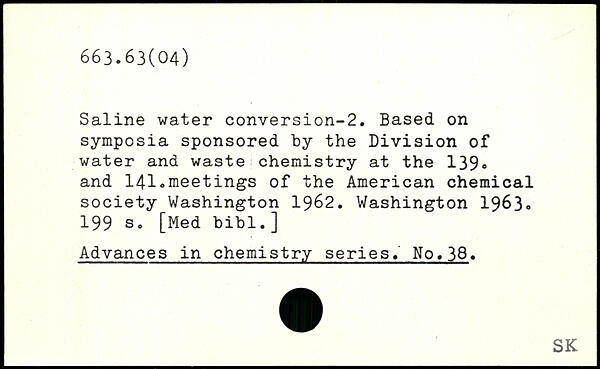 Saline water conversion-2. Based on symposia sponsored by the Division of water and waste chemistry at the 139, and 141.meetings of the American chemical society