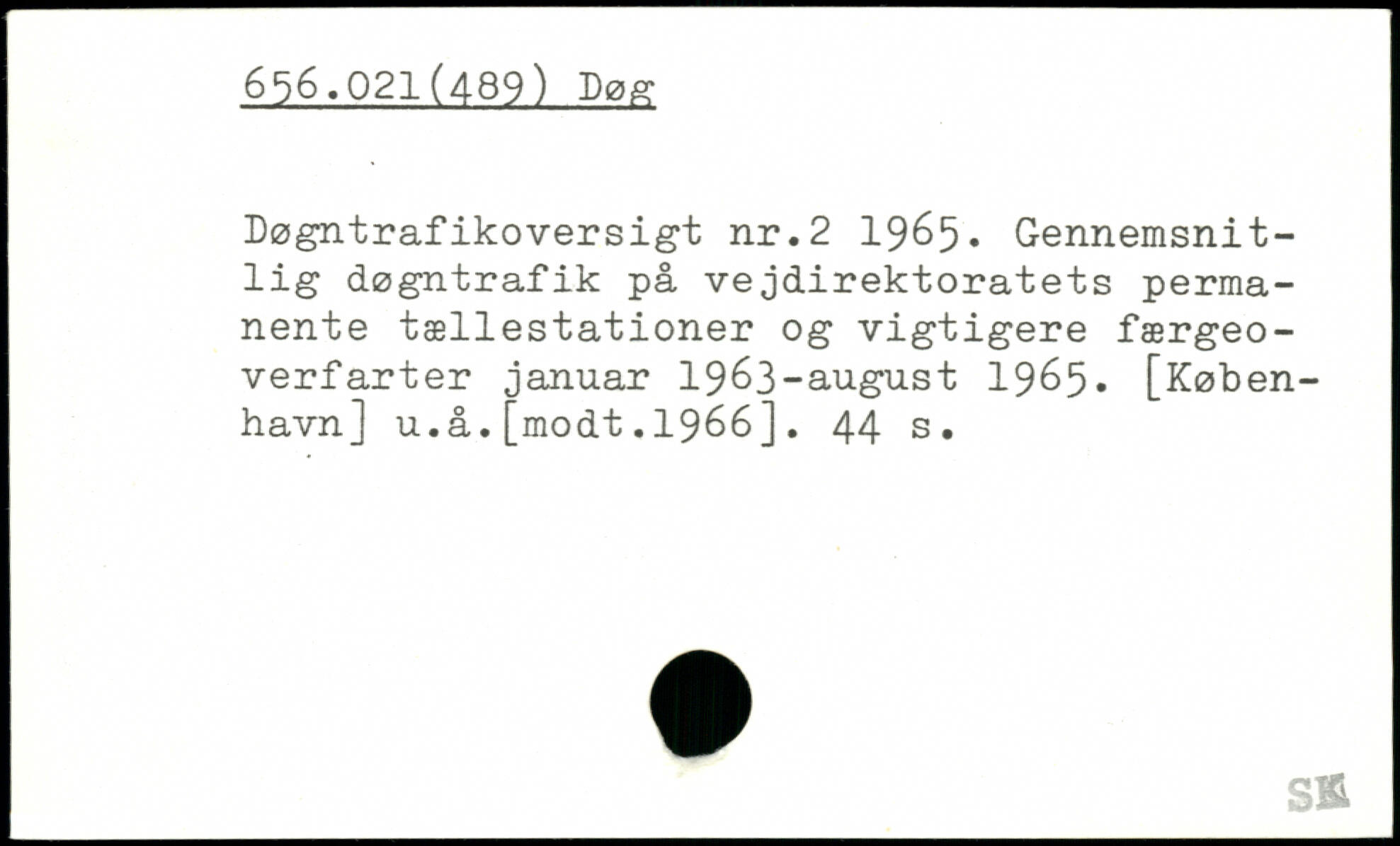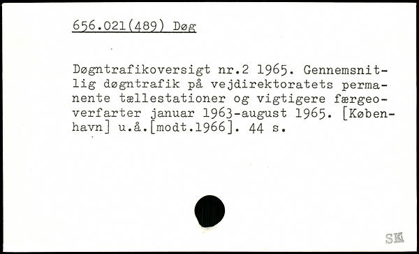 Døgntrafikoversigt nr.2 1965. Gennemsnitlig døgntrafik på vejdirektoratets permanente tællestationer og vigtigere færgeoverfarter januar 1963-august 1965, [København] u.å.[modt.1966].