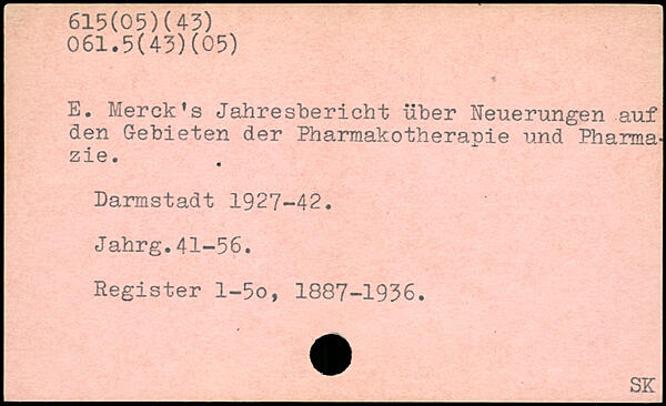 E. Merck's Jahresbericht über Neuerungen auf den Gebieten der Pharmakotherapie und Pharmazie. Darmstadt 1927-42. Jahrg.41-56. Register l-5o, 1887-1936. _SK