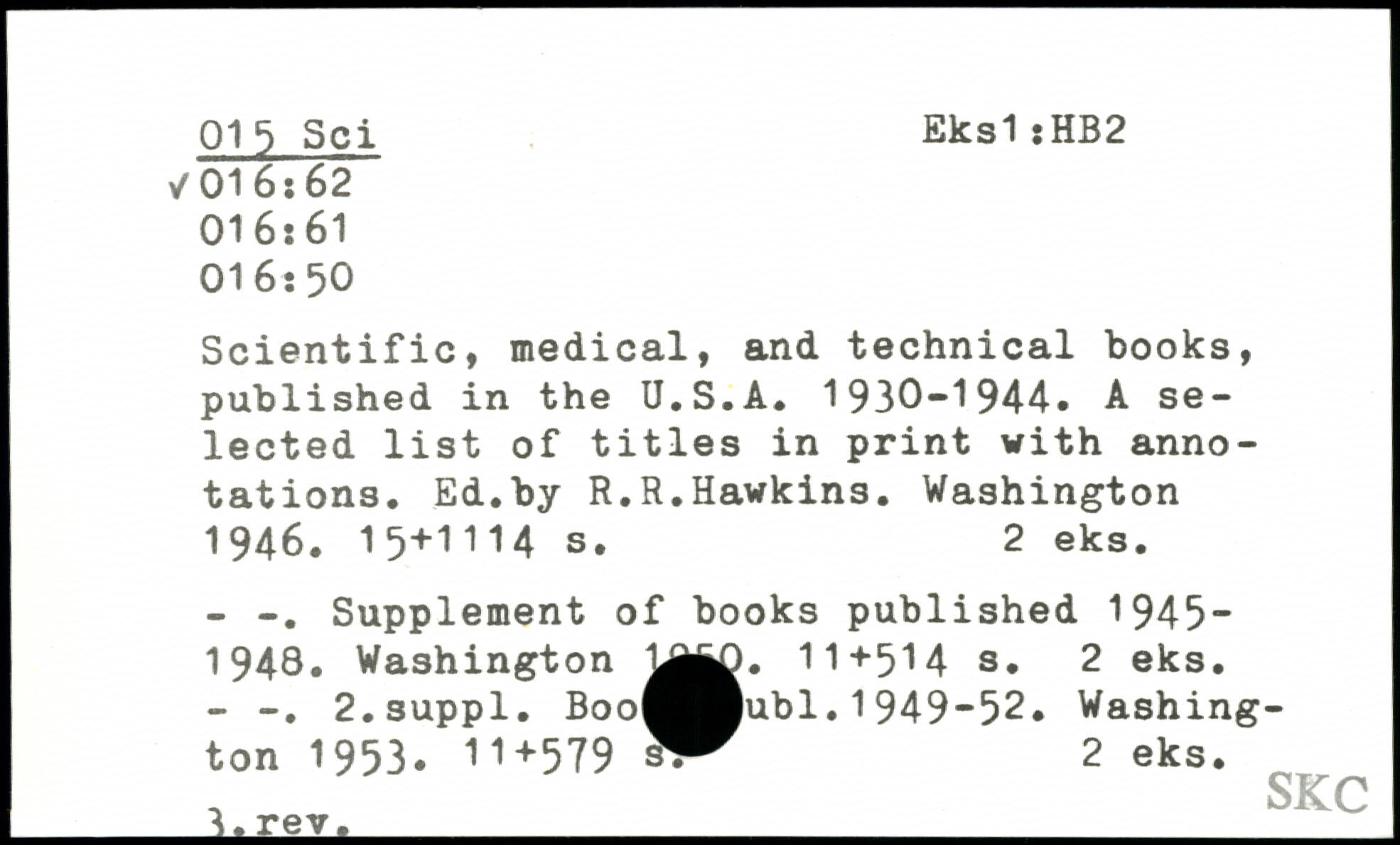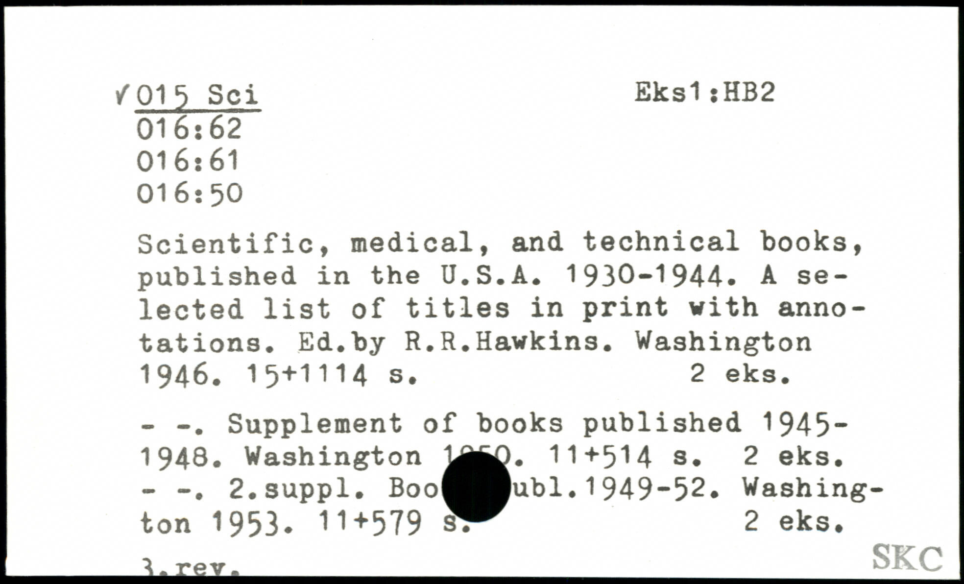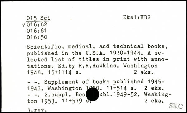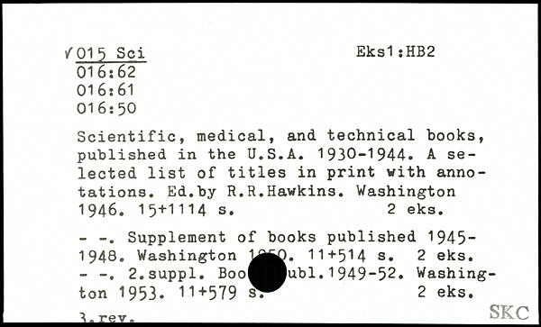 Scientific, medical, and technical books, published in the U.S.A. 1930-1944. A selected list of titles in print with annotations. Ed.by R.R.Hawkins.
