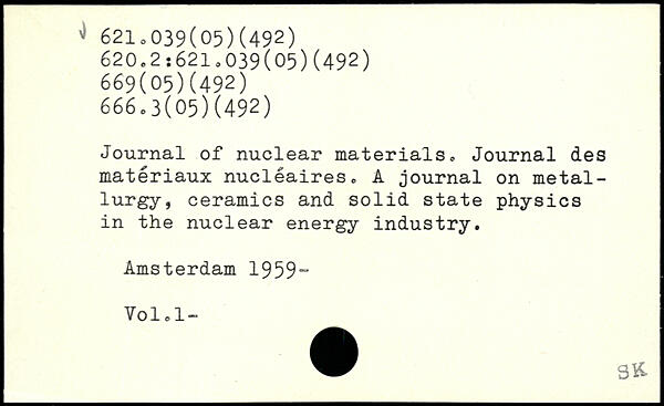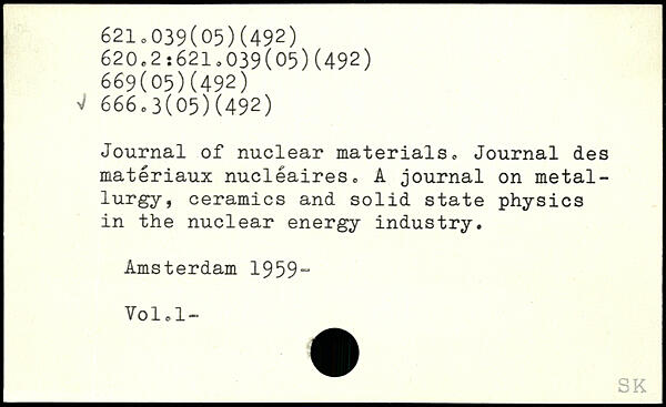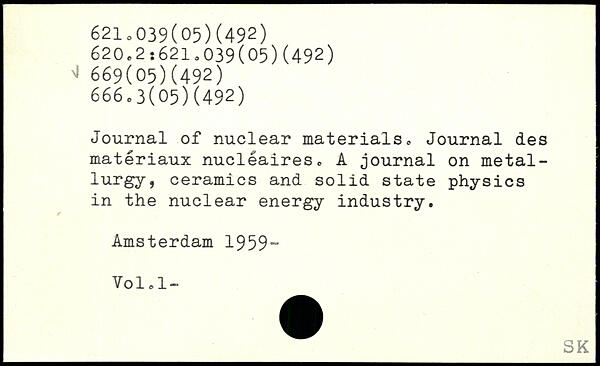 Journal of nuclear materials, Journal des matériaux nucléaires , A journal on metallurgy, ceramics and solid state physics in the nuclear energy industry. Amsterdam 1959“ Vol.l-