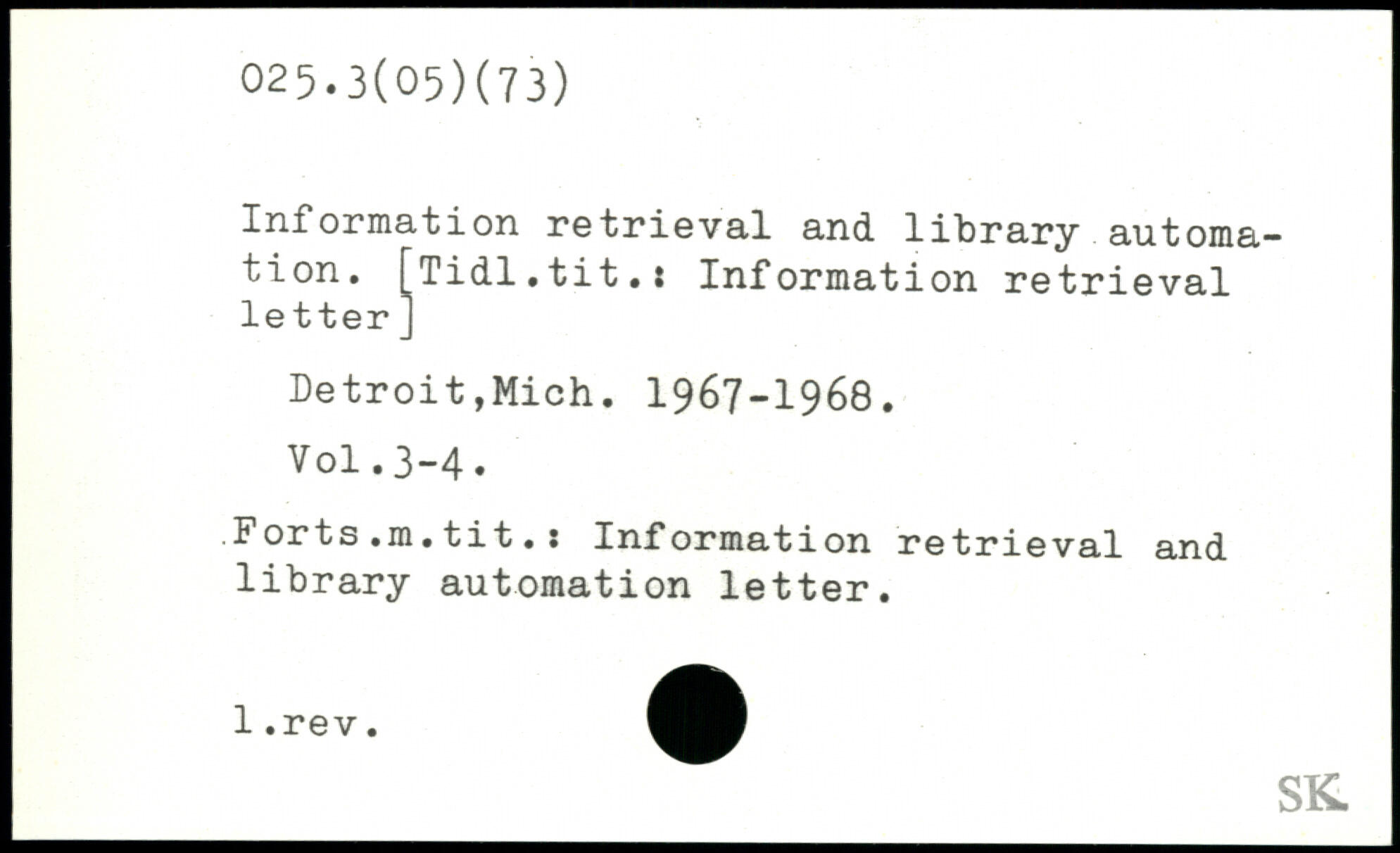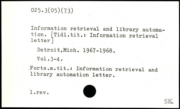 Information retrieval and library automation. [Tidl.tit.: Information retrieval letter ] Detroit,Mich. 1967-1968.