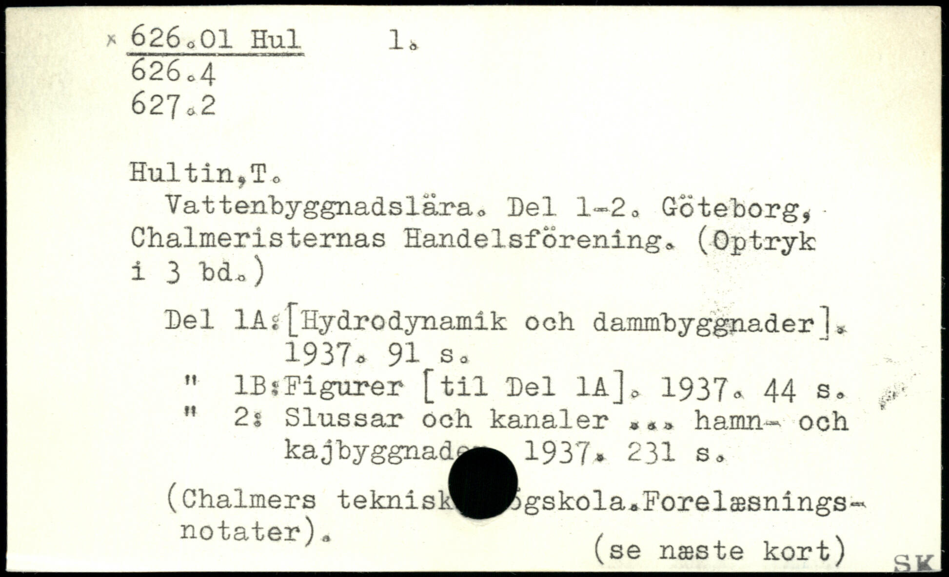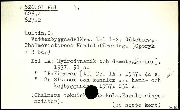 Vattenbyggnadslara. Del 1-2, Göteborg, Chalmeristernas Handelsförening. (Optryk i 3 bd.) Del lAs[Hydrodynamik ooh dammbyggnader]. 1937-