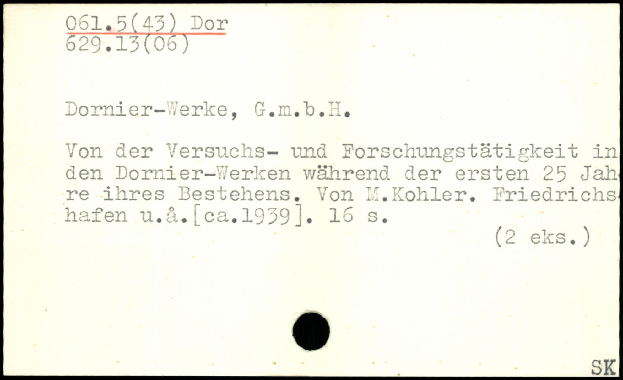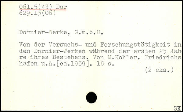 Dornier-Werke, G-.m.h.H. Von der Versuchs- und Forschungstätigkeit in den Domier-Werken während der ersten 25 Jah re ihres Bestehens. Yon M.Köhler. Friedrichs hafen u.ä.[ca.1959].