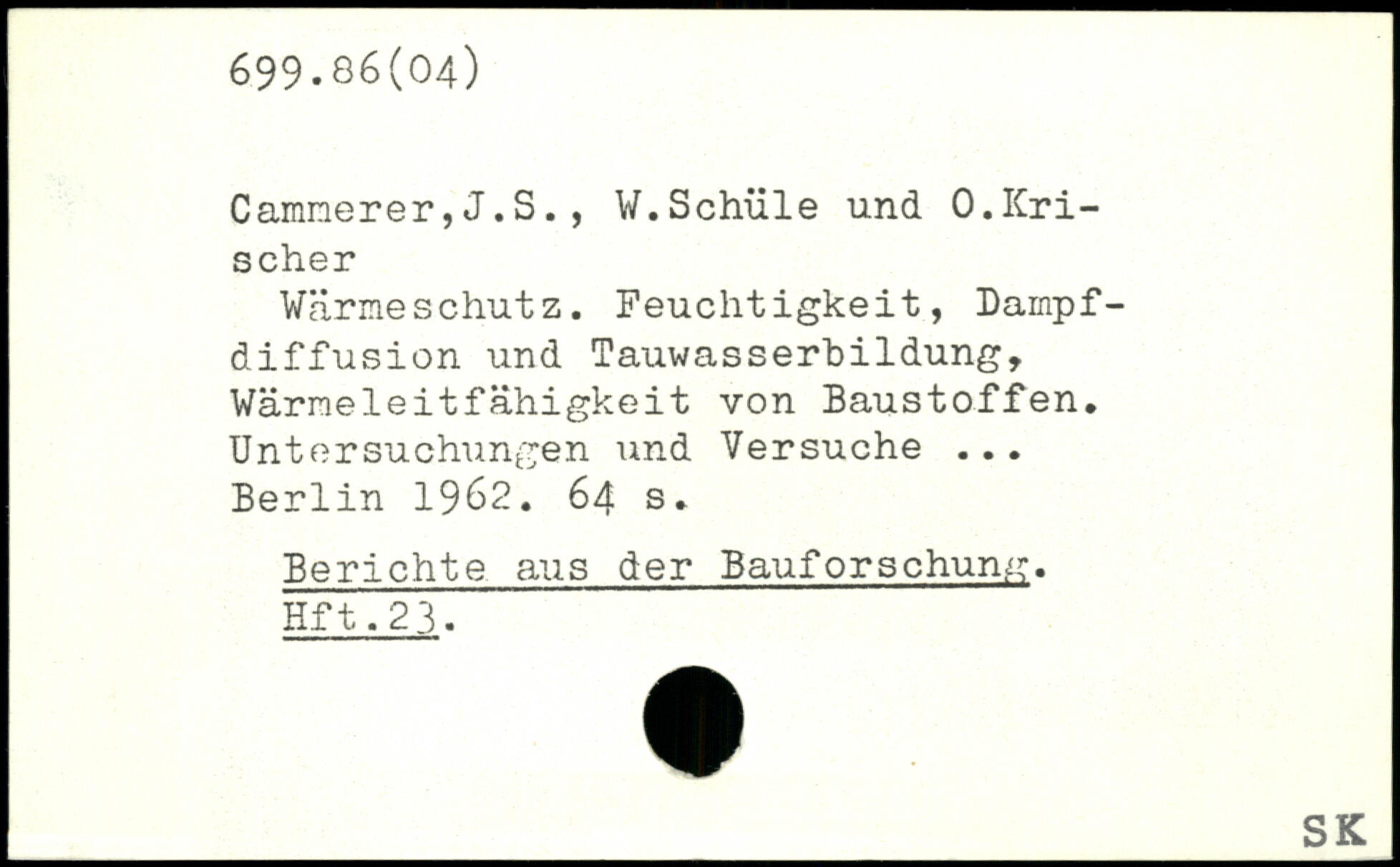 Cammerer, J.S. , V. Schule und 0.lyrischer Wärmeschutz. Feuchtigkeit, Dampf-diffusion und Tauwasserbildung, Wärmeleitfähigkeit von Baustoffen, Untersuchungen und Versuche ...