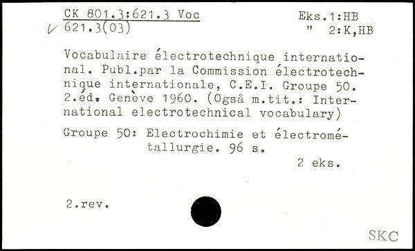 Vocabulaire électrotechnique international. Publ.par la Commission electrotech-nique internationale, C.E.I. Groupe 50.