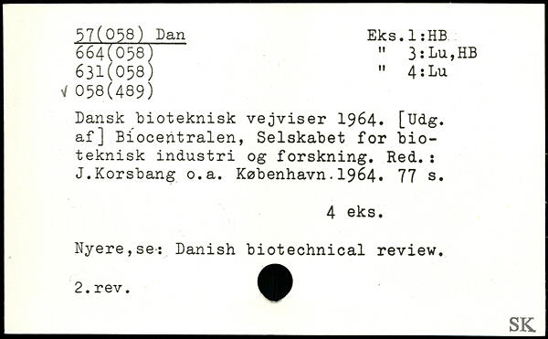 Dansk bioteknisk vejviser 1964. [Udg. af] Biocentralen, Selskabet for bioteknisk industri og forskning. Hed.: J.Korsbang o.a. København.1964.