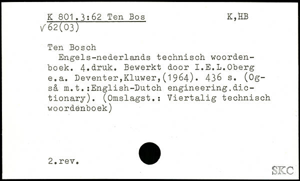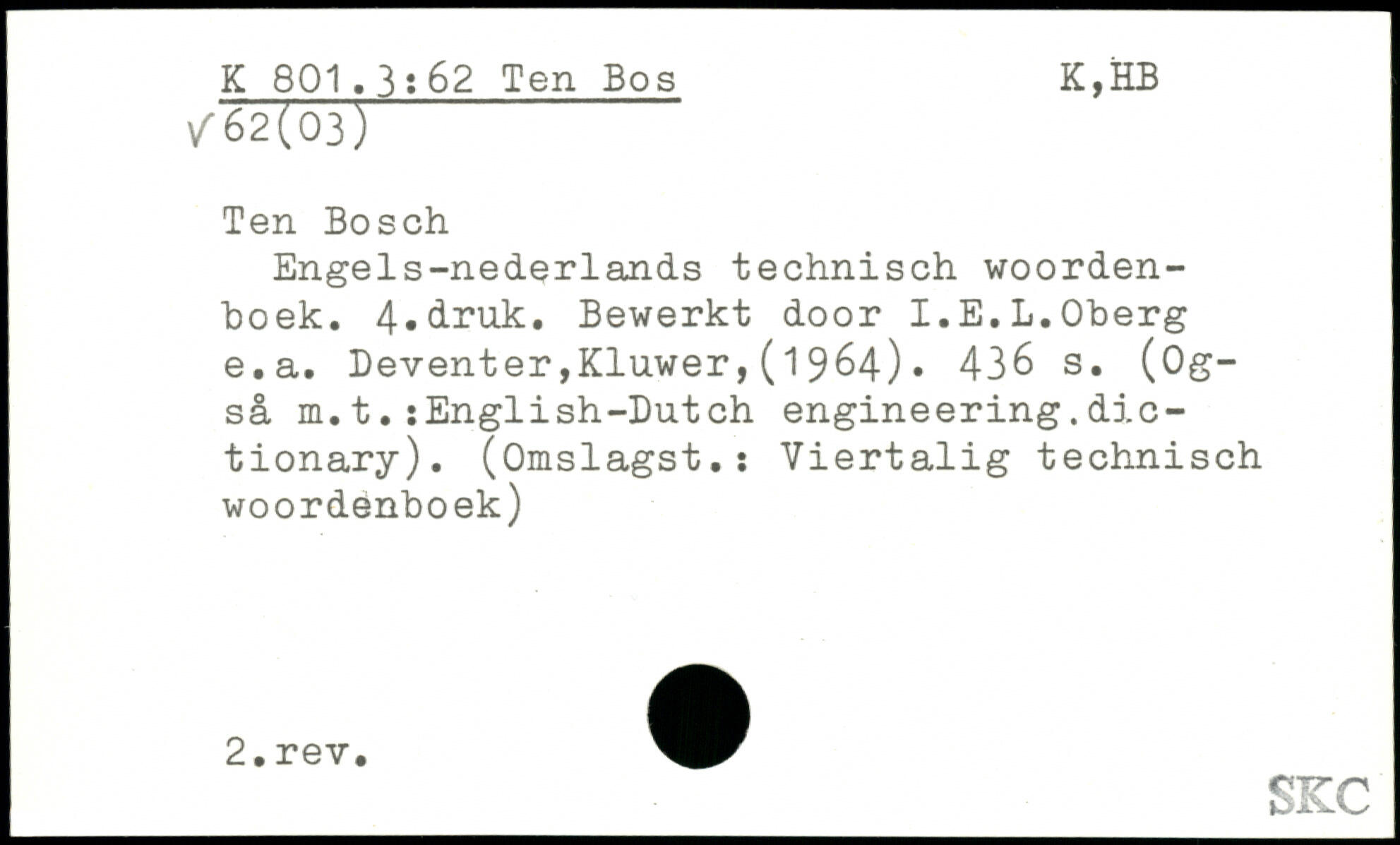 Ten Bosch Engels-nederlands technisch woorden-hoek. 4,d.ruk. Bewerkt door I.E.L.Oberg e.a. Deventer,Kluwer,(1964).