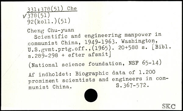Cheng Chu-yuan Scientific and engineering manpower in communist China, 1949-1963- Washington, U.S.gvmt.prtg.off.,(1965)-