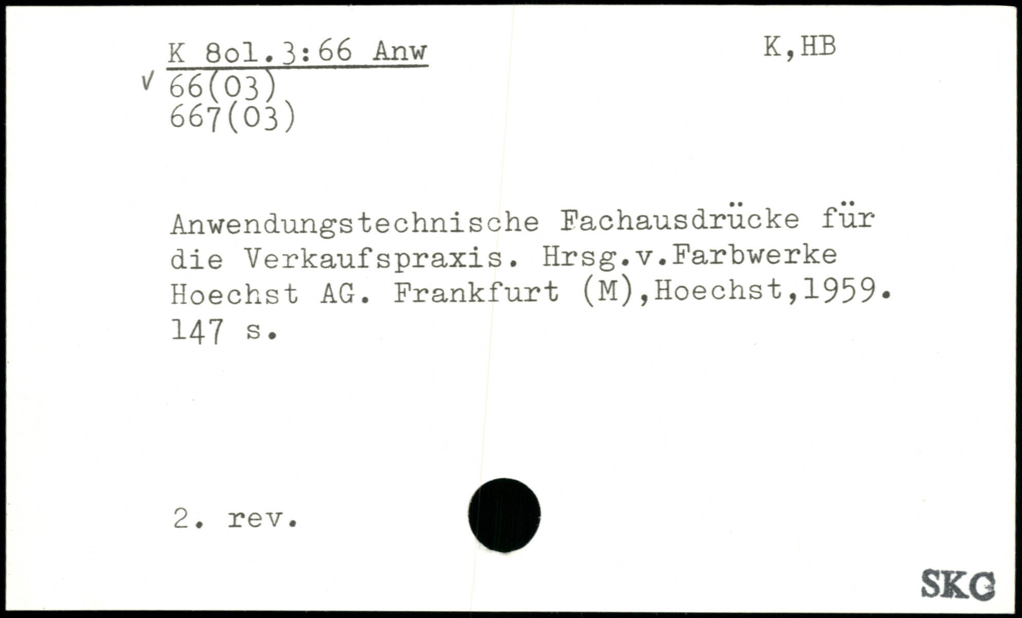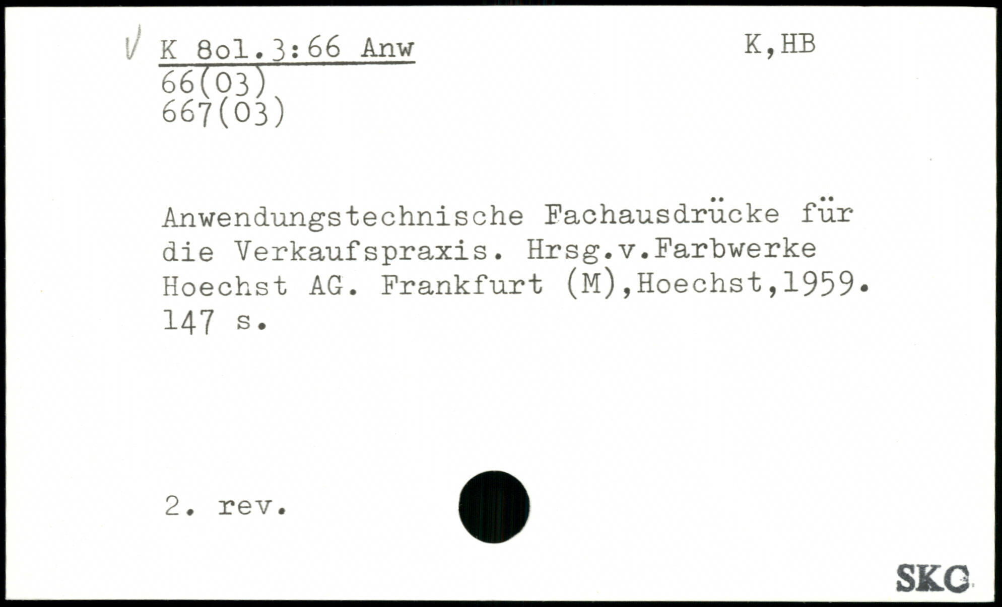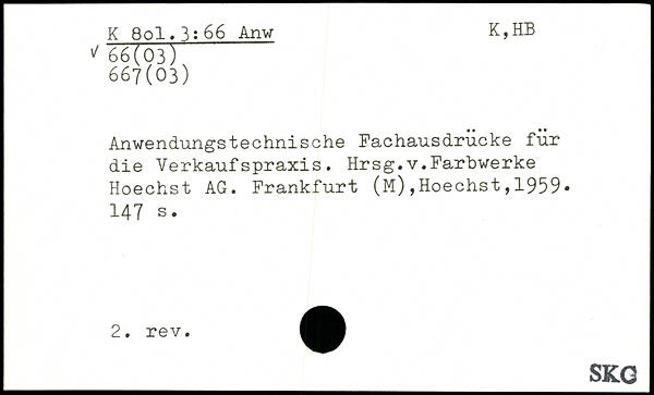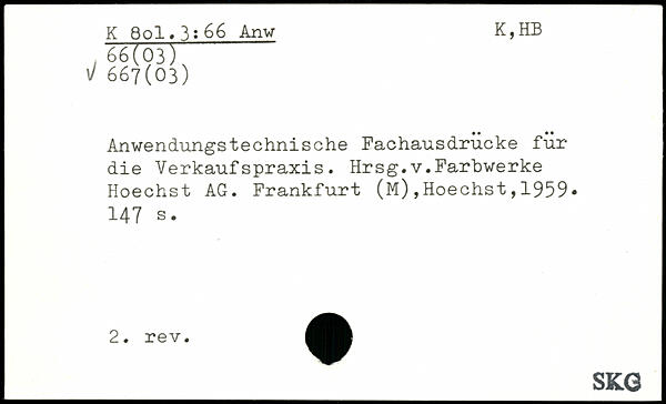 l/ K Sol. 3:66 Anw K,HB 66(03)' 667(03) Anwendungstechnische Fachausdrucke für die Verkaufspraxis. Hrsg.v.Farbwerke Hoechst AG. Frankfurt (M),Hoechst,1959.