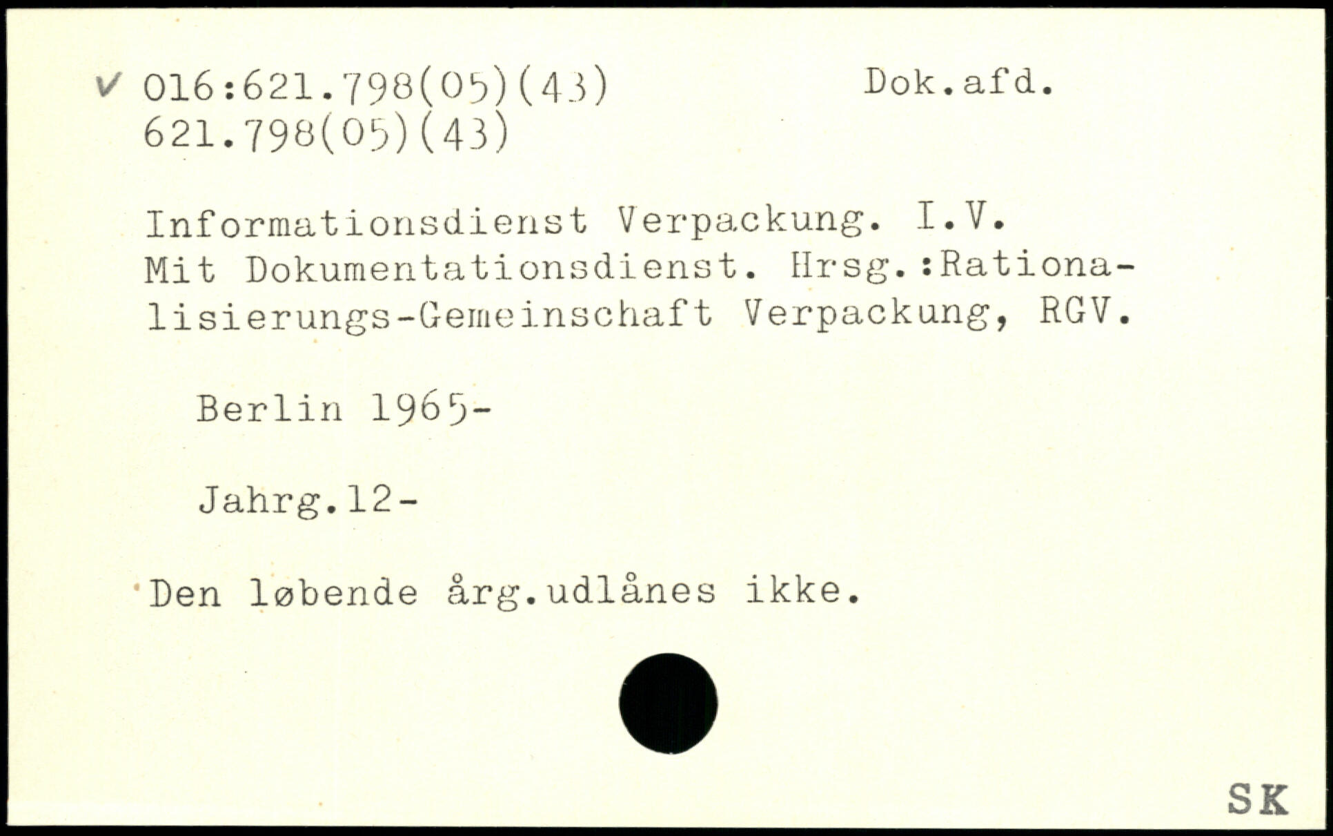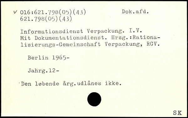 Informationsdienst Verpackung. I.V. Mit Dokumentationsdienst. Hrsg.:Rationa-lisierungs-Geraeinschaft Verpackung, RGV.